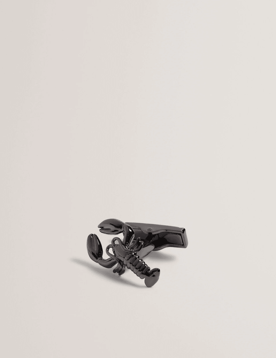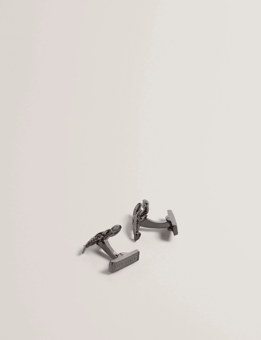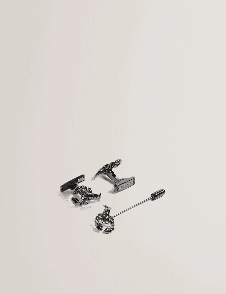 Discover the perfect blend of elegance and charm with the Ted Baker MARIINE | GUNMET-COL. These exquisite cufflinks and lapel pin showcase a stunning lobster design, crafted to make a statement at any formal occasion. With shiny gunmetal plating and engraved branding, they’re an essential addition to your accessory collection.