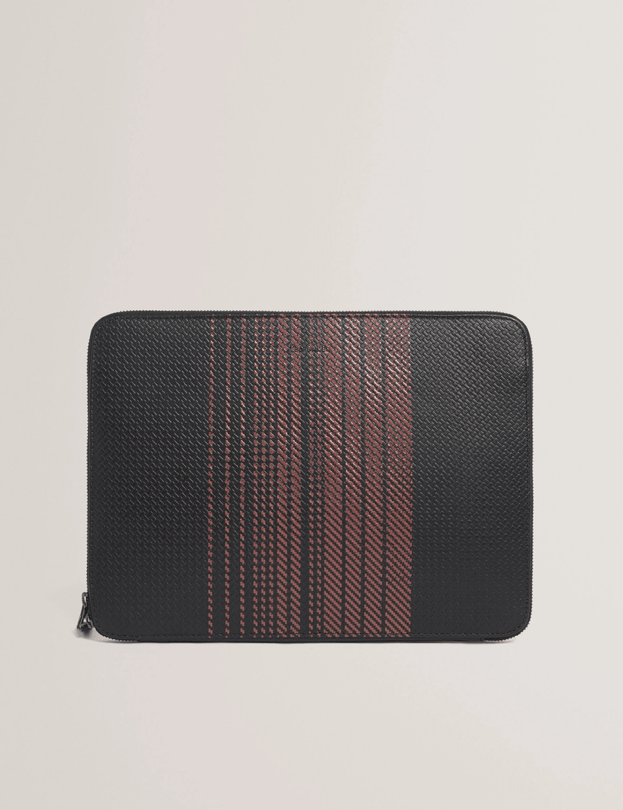 Introducing the Ted Baker WARENN | BLACK, the perfect blend of style and functionality for your 13-inch laptop. This sleek laptop sleeve is designed to protect your device while making a statement. With a unique woven texture and a chic gradient stripe front, this accessory is a must-have for the modern professional.