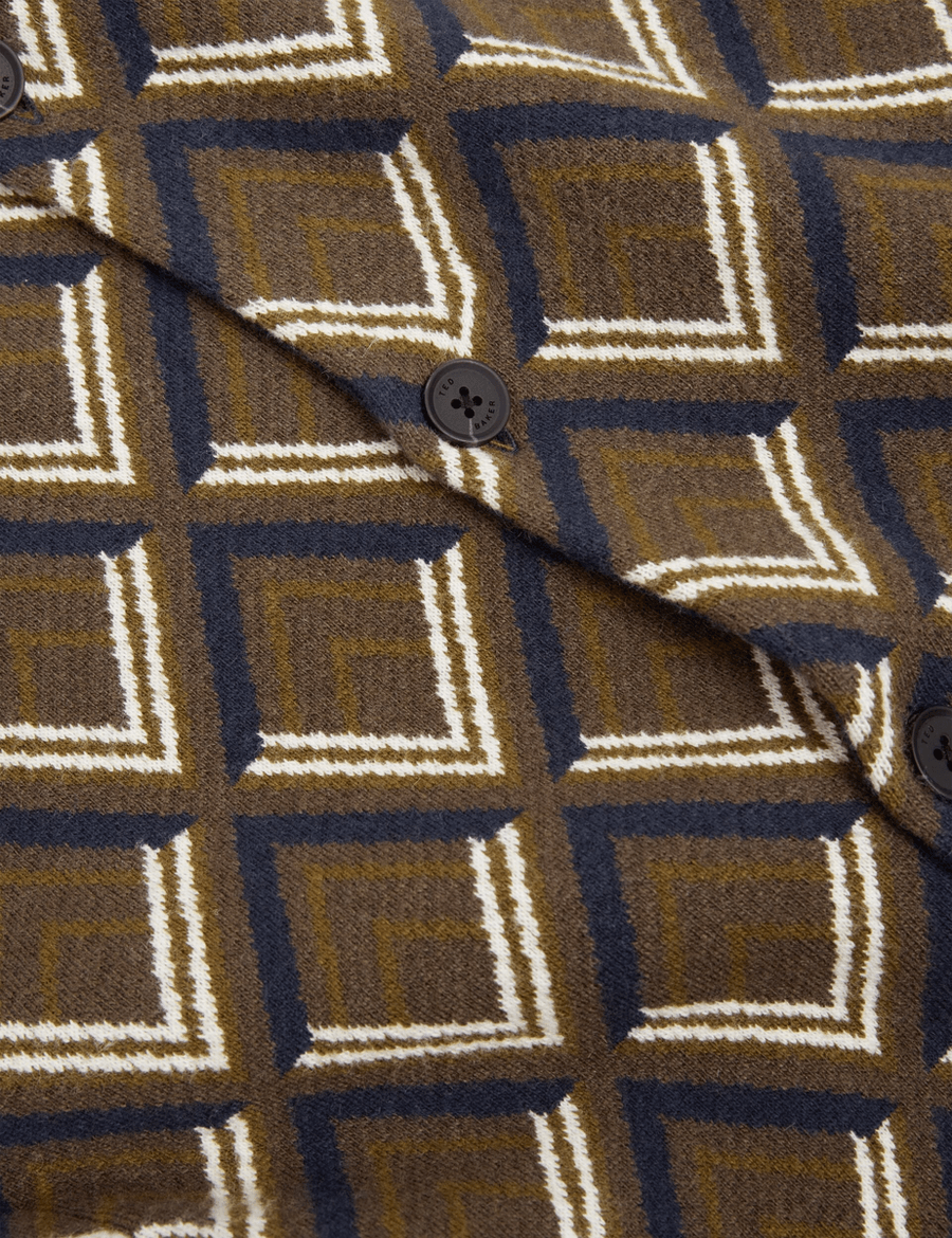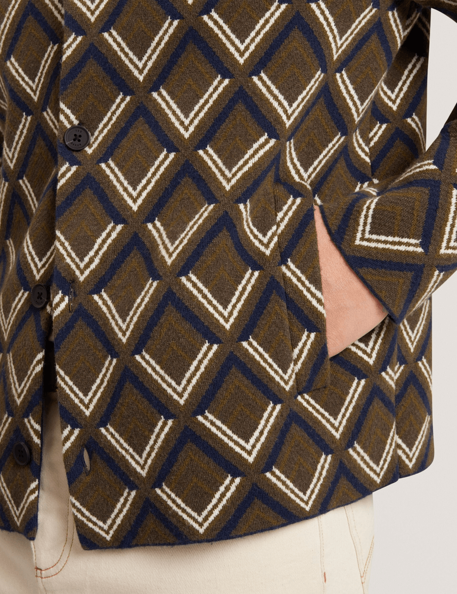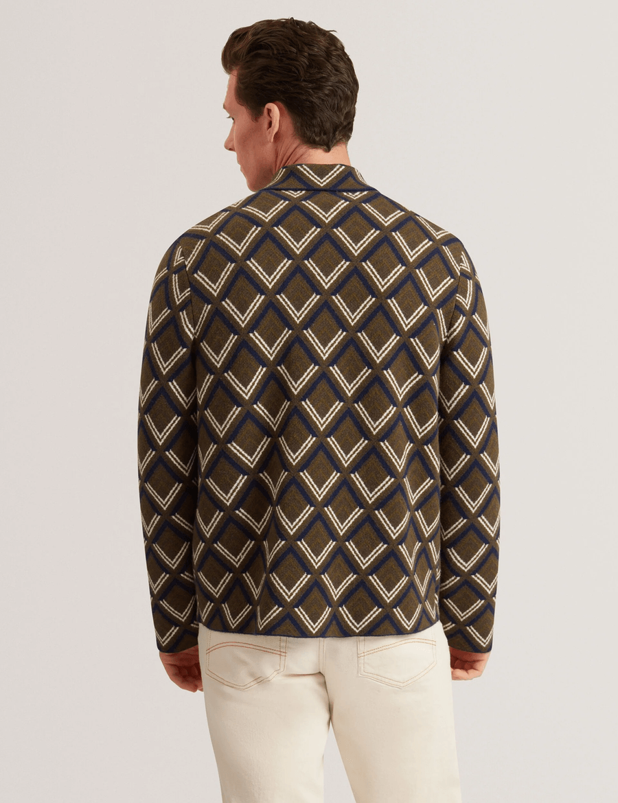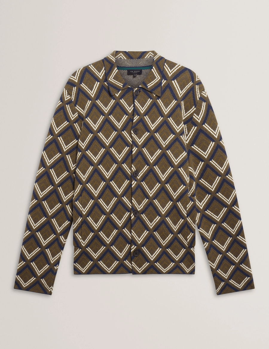 Discover the perfect blend of sophistication and comfort with the Ted Baker DICAPRI | KHAKI knitted cardigan jacket. This stunning piece features a two-tone diamond pattern crafted from a luxurious wool and cashmere blend, making it an essential addition to your wardrobe.