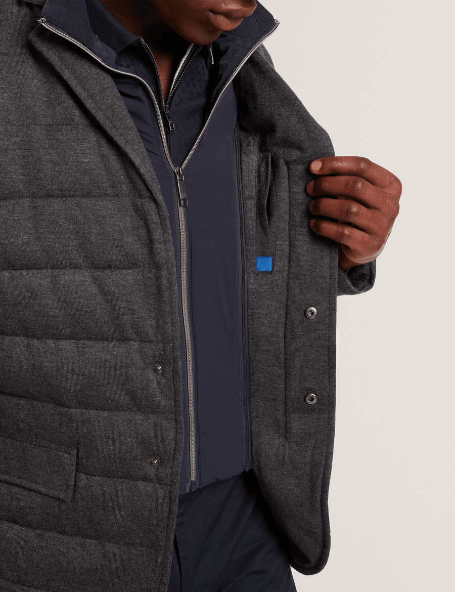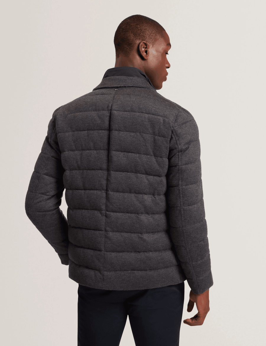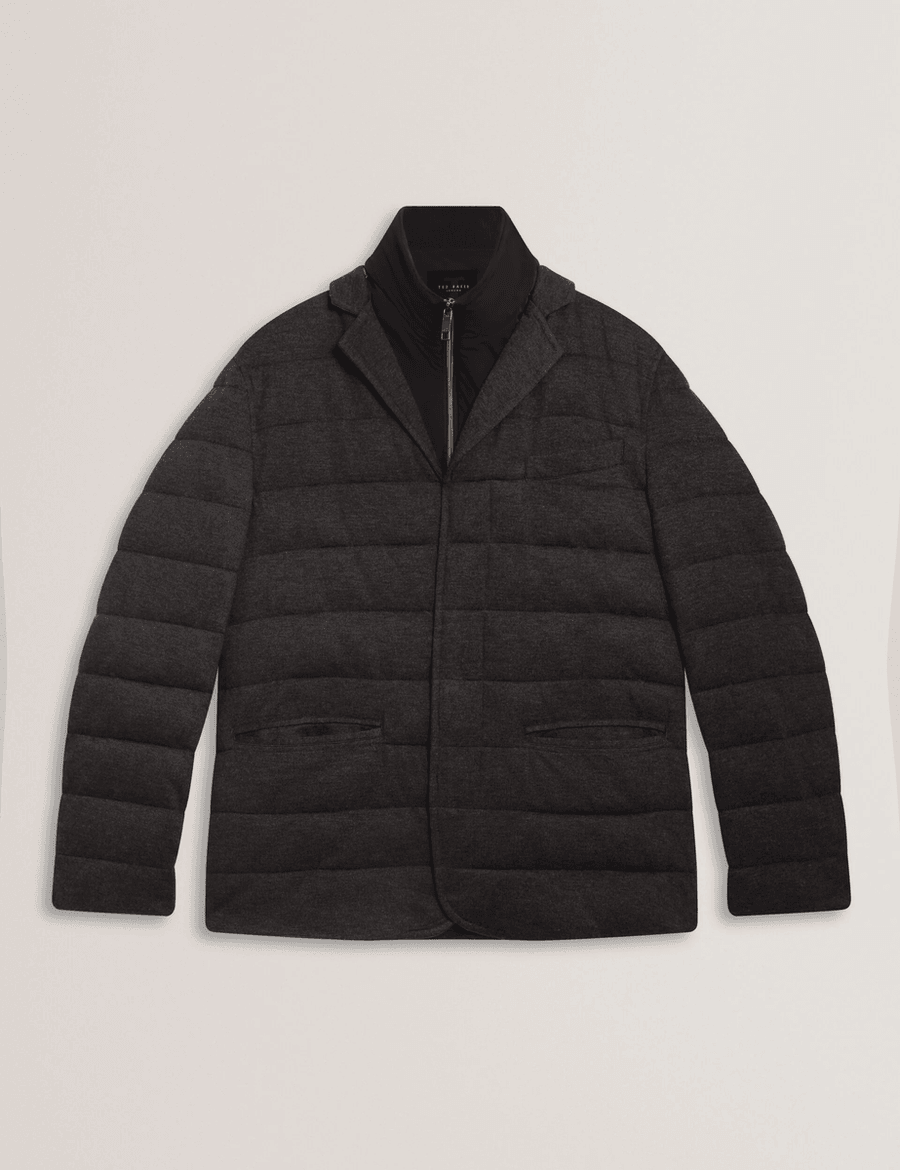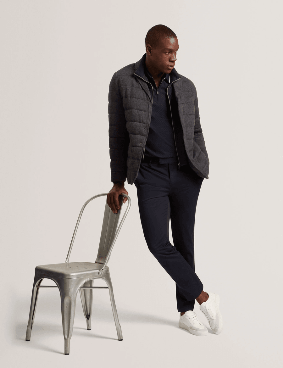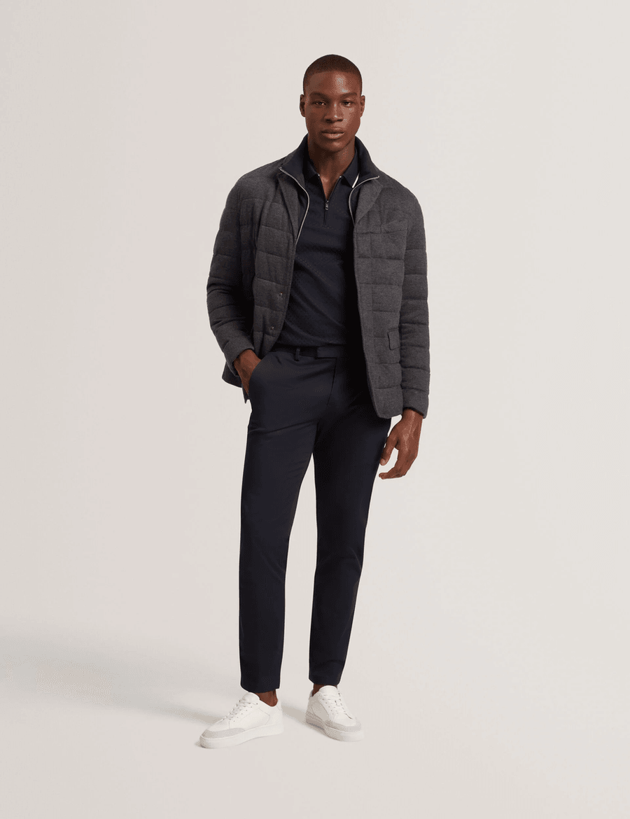 The Ted Baker GEROME | CHARCOAL blazer jacket is designed for both sophistication and comfort. With its unique quilted design, this lightweight jacket is perfect for transitional seasons. The funnel neck not only enhances your look but also keeps you warm on chilly days. Chris, who is 6'2" (1.87m), wears a Ted size 3, showcasing the tailored fit that suits any body type.