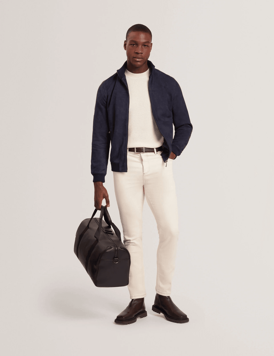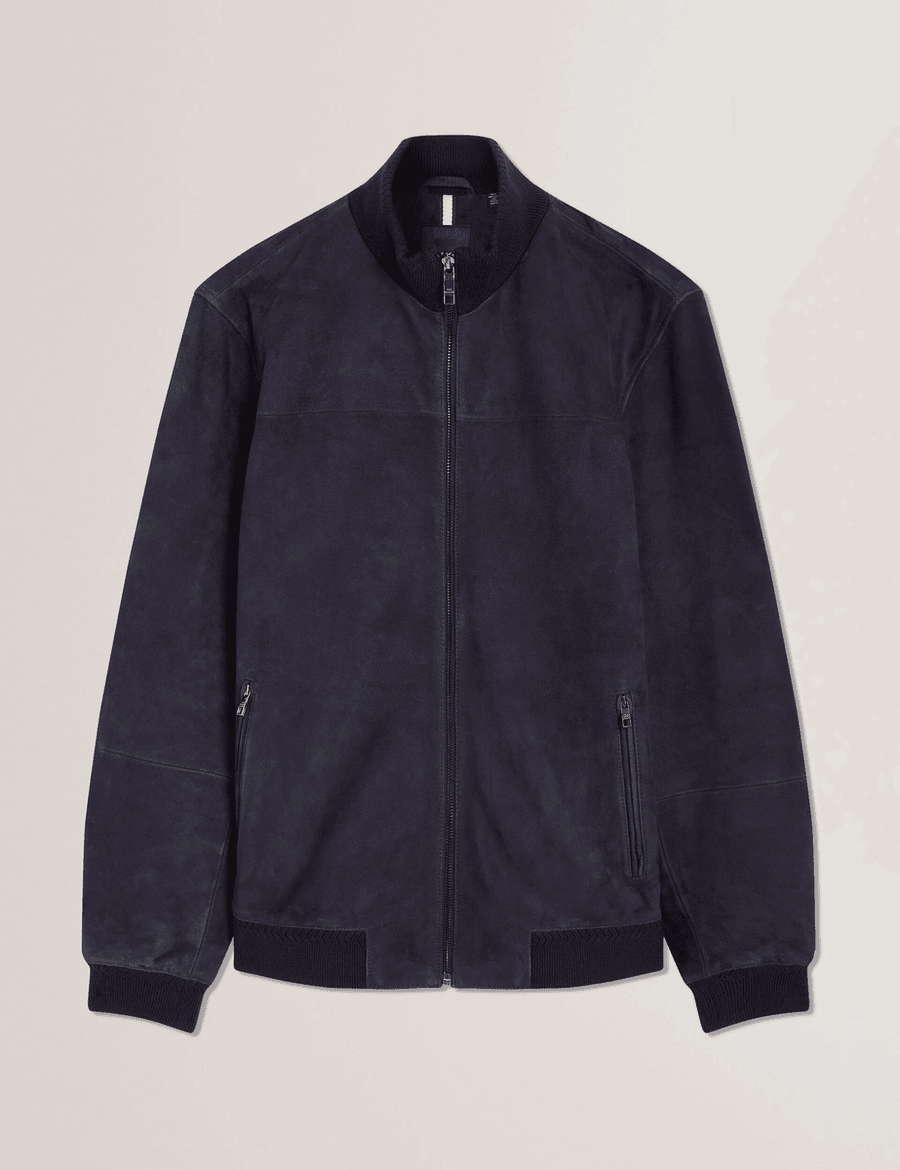 Elevate your style with the Ted Baker PEVERIL, a stunning navy bomber jacket crafted from premium suede leather. This jacket combines contemporary design with classic sophistication, making it a must-have for any fashion-forward wardrobe.