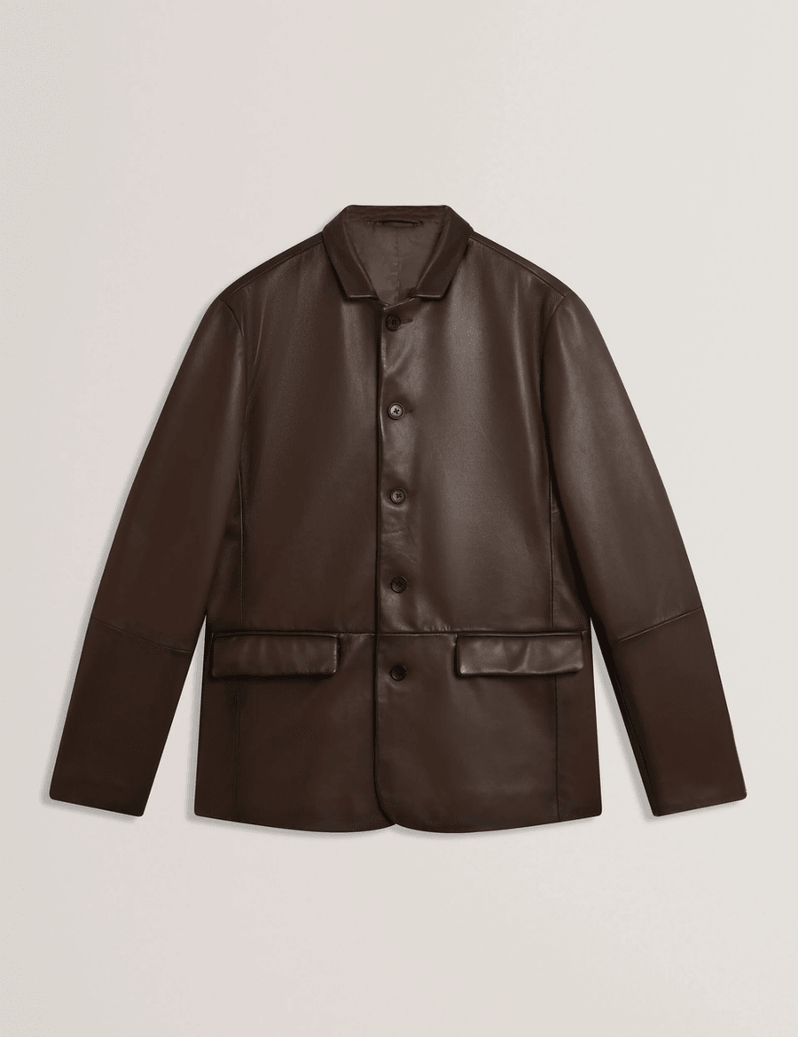 Discover the sophistication of the Ted Baker SEINEJ | DK-BROWN jacket, crafted from premium burnished leather. This regular fit jacket combines elegance with comfort, perfect for any modern wardrobe.