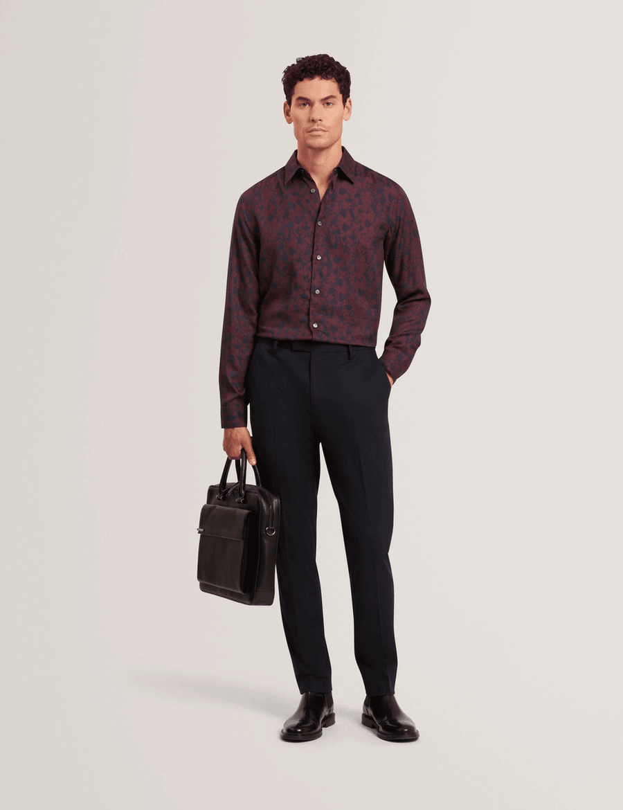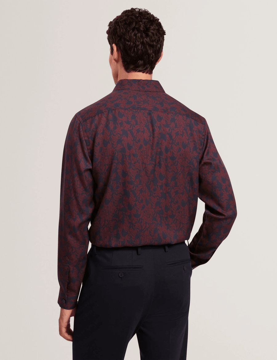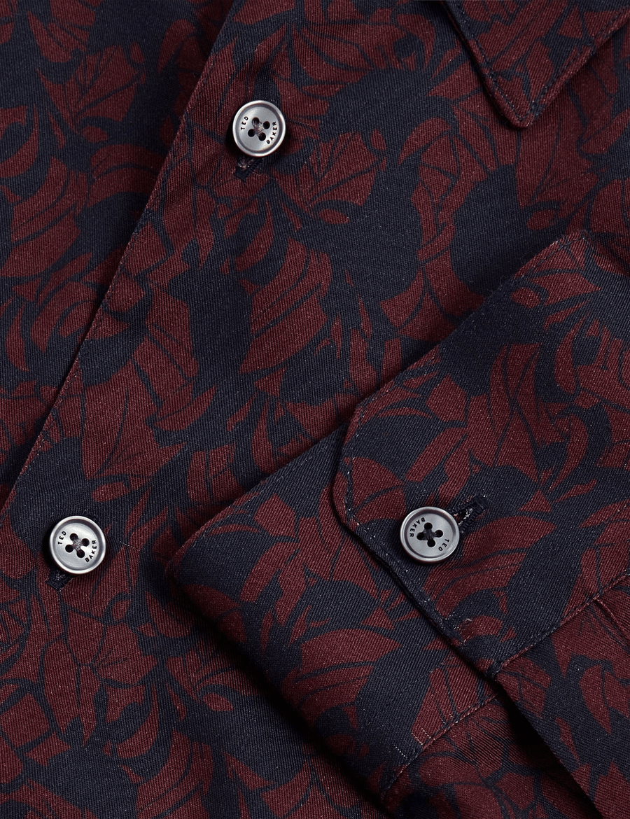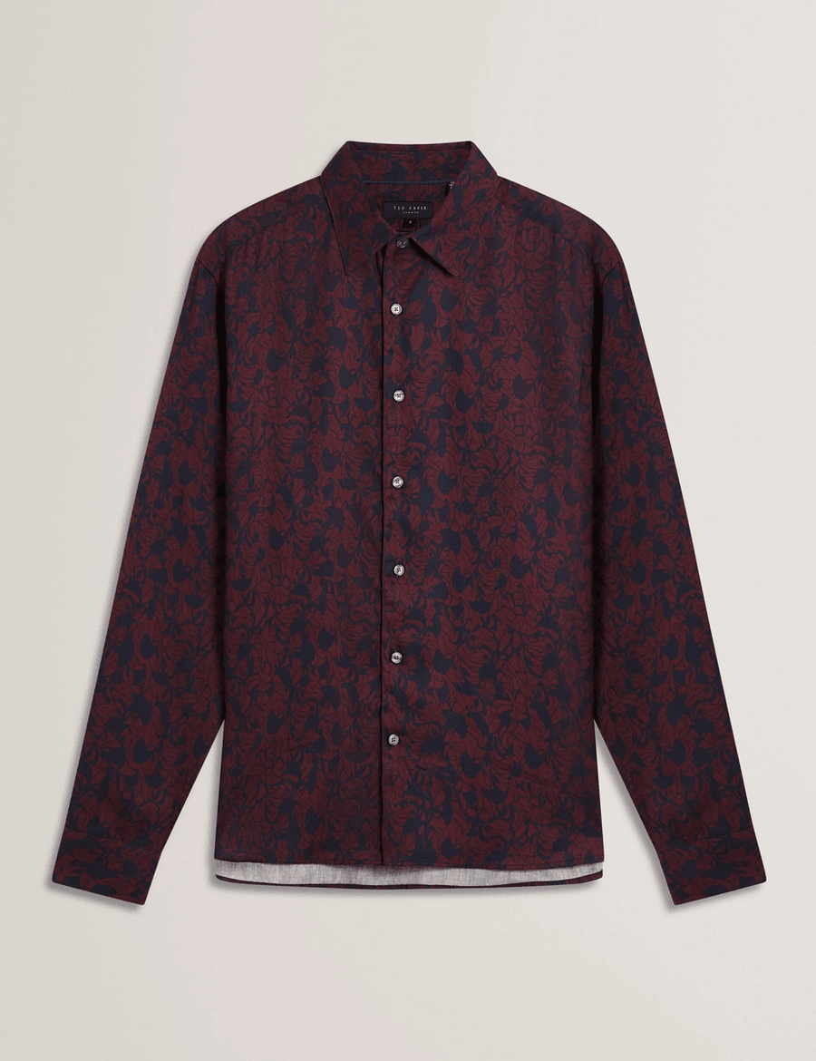Discover the stunning Ted Baker AKSELLE | MAROON, a long-sleeve shirt that effortlessly combines sophistication with comfort. Featuring a striking dark tonal floral print, this shirt is designed to make a statement at any occasion.