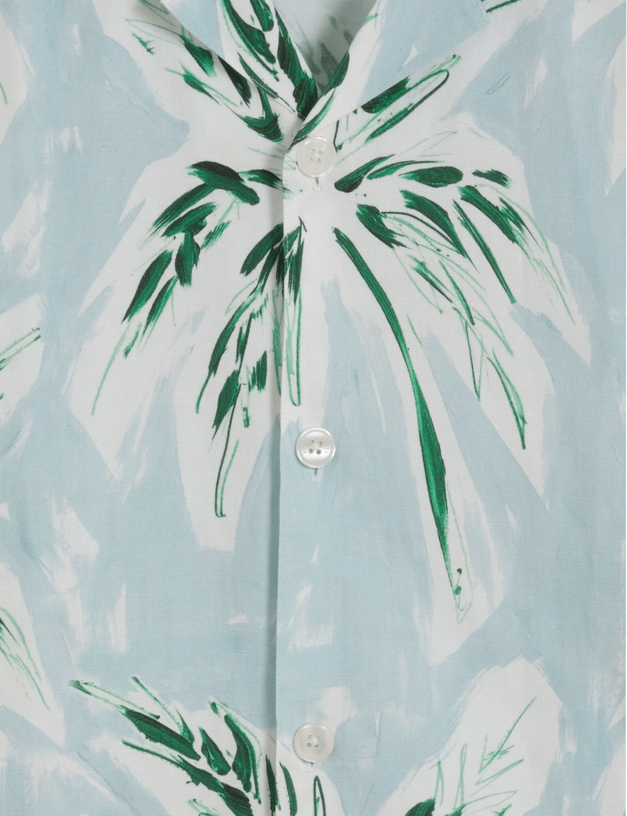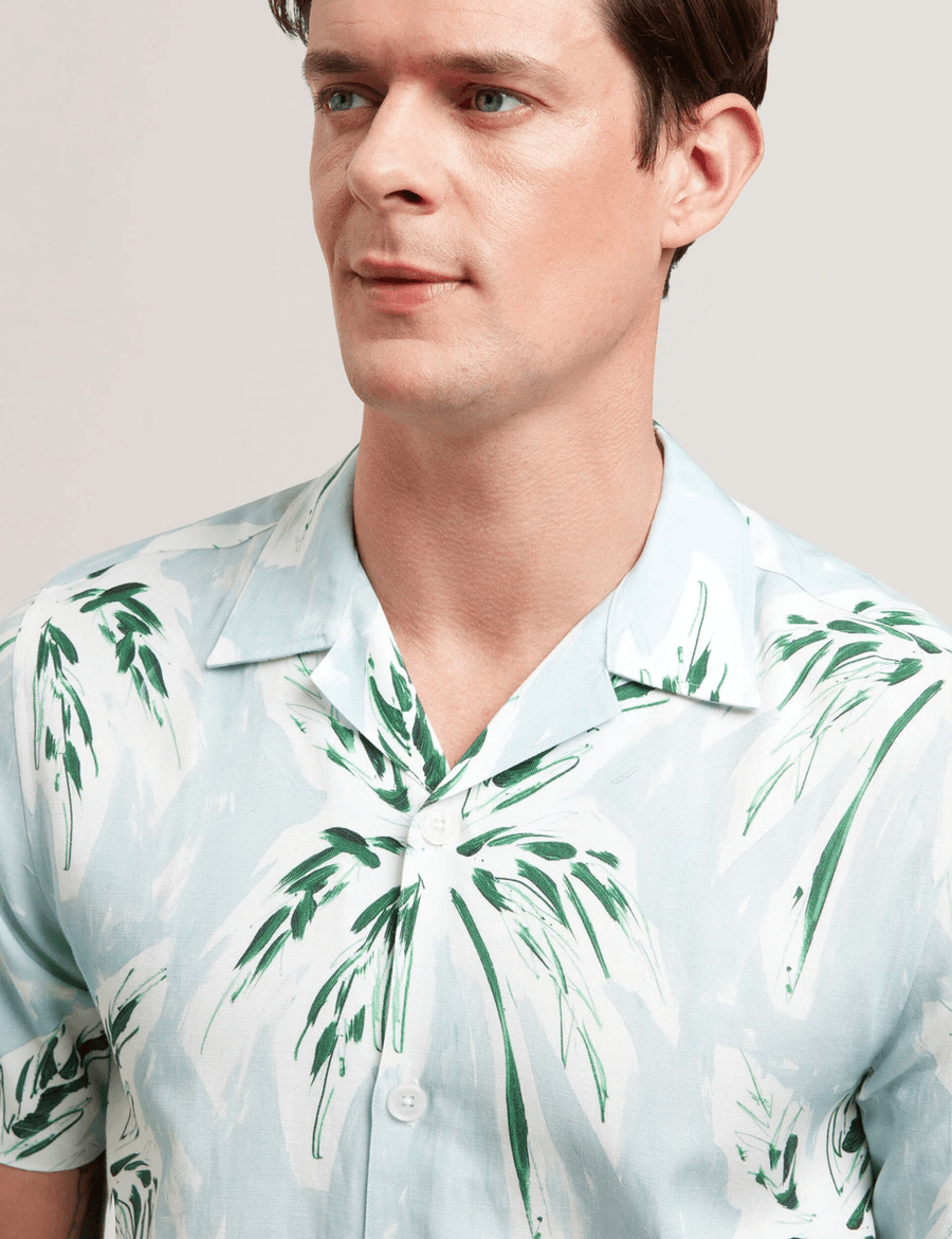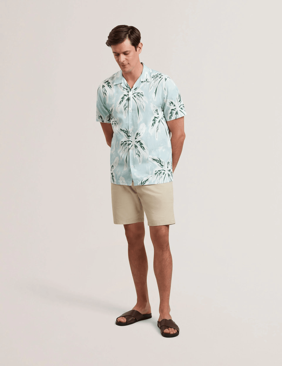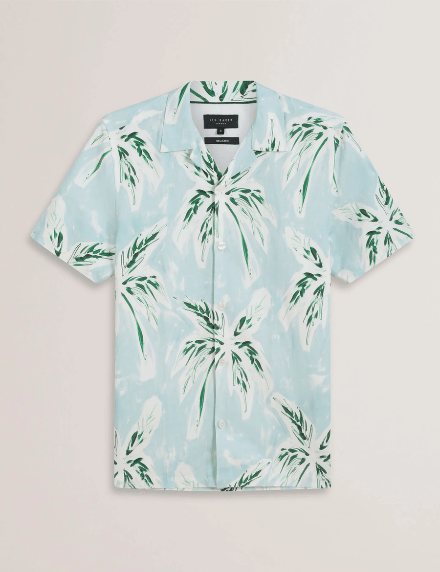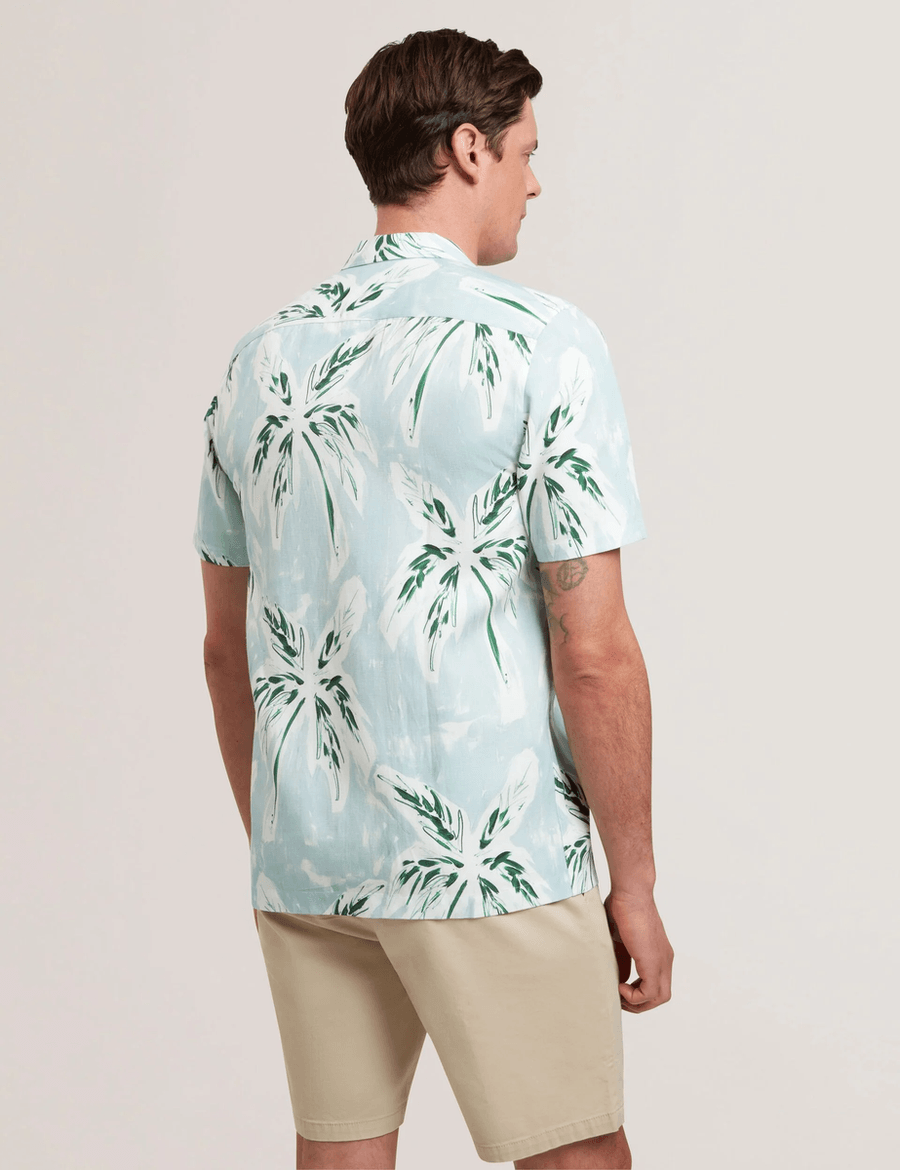Discover the perfect blend of comfort and style with the Ted Baker BOCHE | PL-GREEN short sleeve shirt. Featuring a stunning painted palm tree print, this shirt adds a touch of tropical flair to any wardrobe. Crafted from a light linen blend, it ensures you stay cool and relaxed, making it ideal for warm-weather outings.