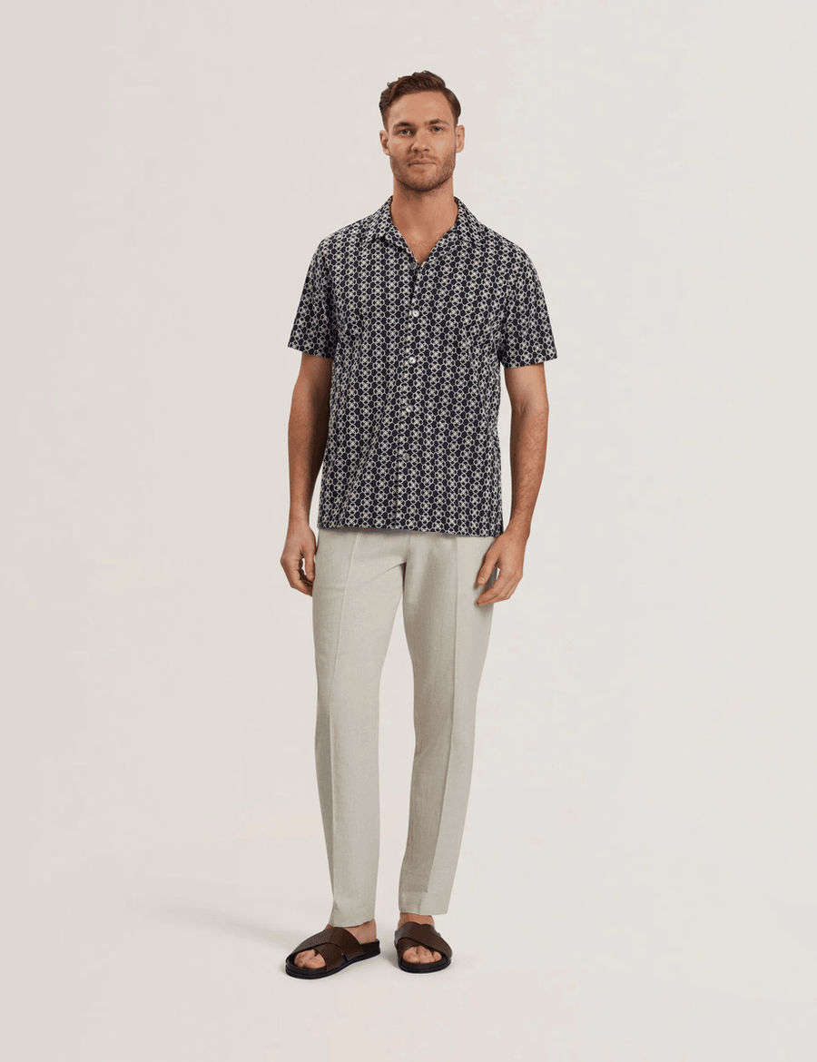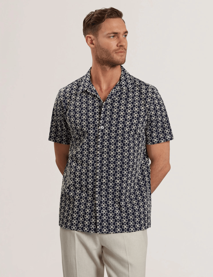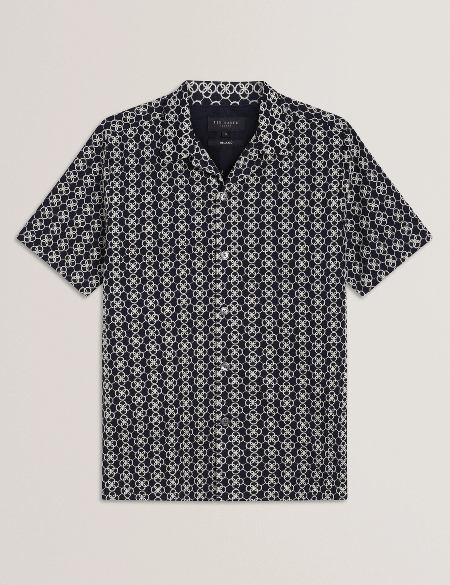 Elevate your wardrobe with the Ted Baker FINLAYS | NAVY shirt, the perfect blend of style and comfort. This short sleeve shirt features an exquisite all-over embroidered pattern, making it a standout choice for any occasion.