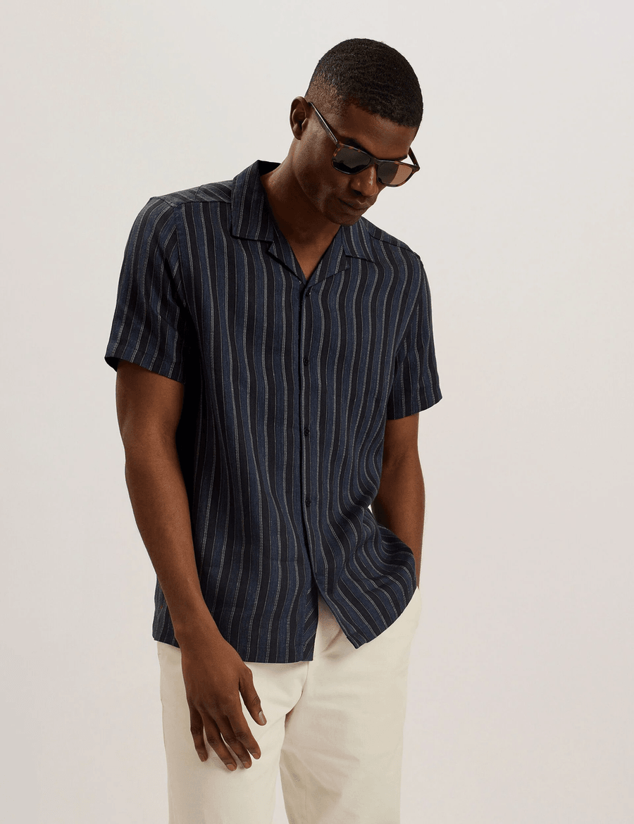 Discover the perfect blend of style and comfort with the Ted Baker FRANCOI | NAVY short sleeve shirt. Crafted from a light cotton-linen blend, this shirt features a sophisticated vertical striped design that adds a touch of elegance. Ideal for both casual outings and more polished occasions, the FRANCOI shirt is a must-have in your wardrobe.