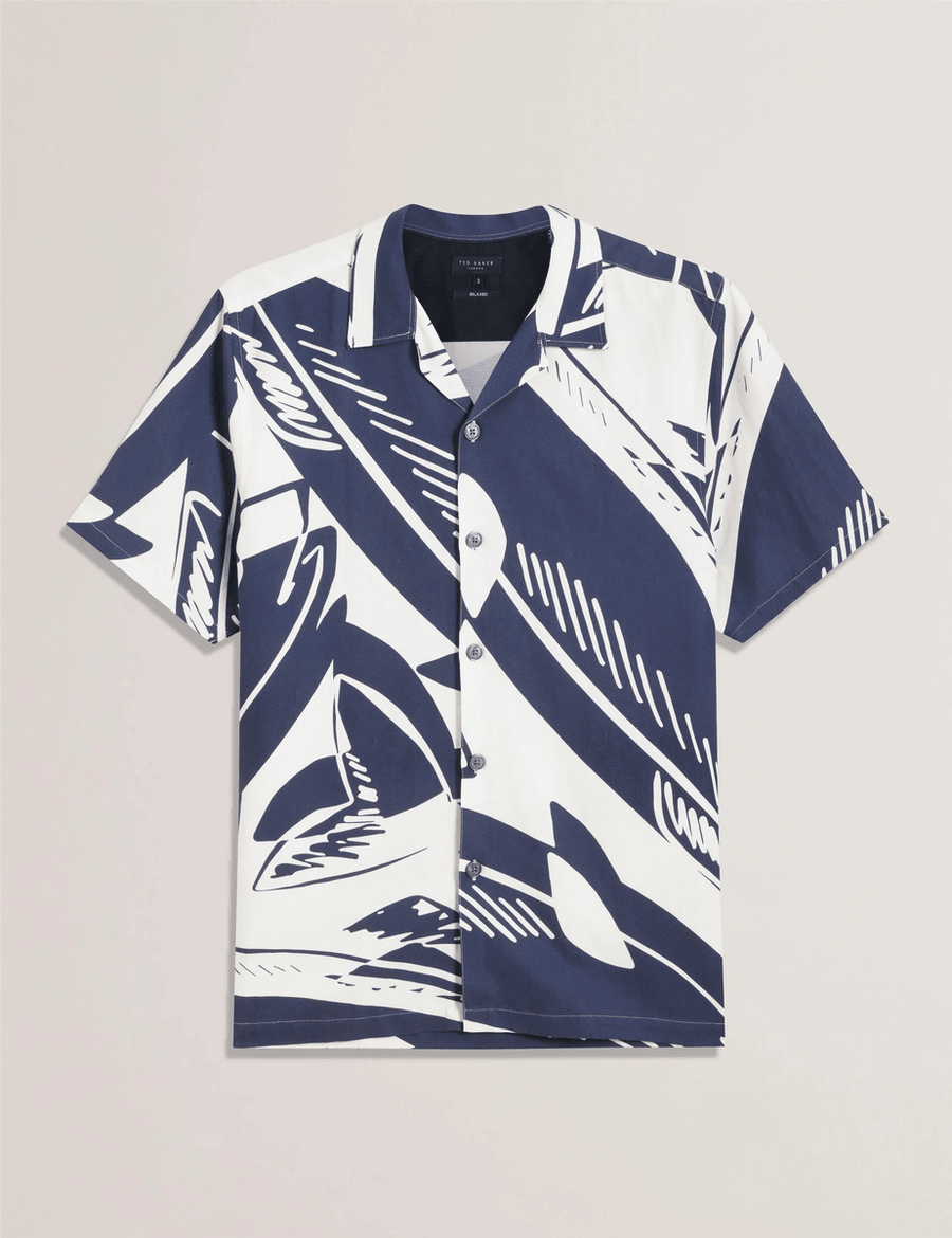 Elevate your wardrobe with the Ted Baker HEUKELS | MID-NAVY, a stylish and relaxed shirt designed for effortless sophistication. Featuring a unique sketched fish print, this shirt combines a light linen blend with a contemporary revere collar, making it the perfect choice for casual outings or laid-back office days.