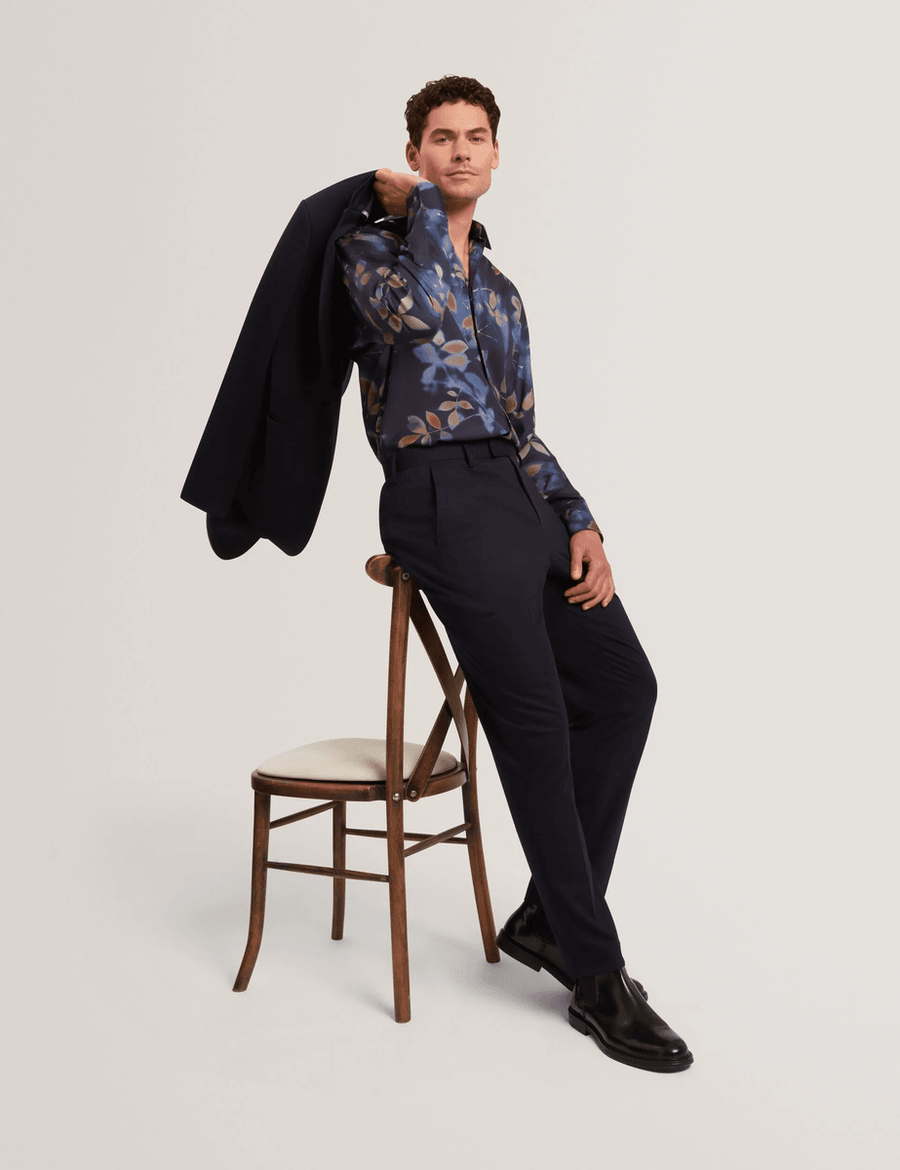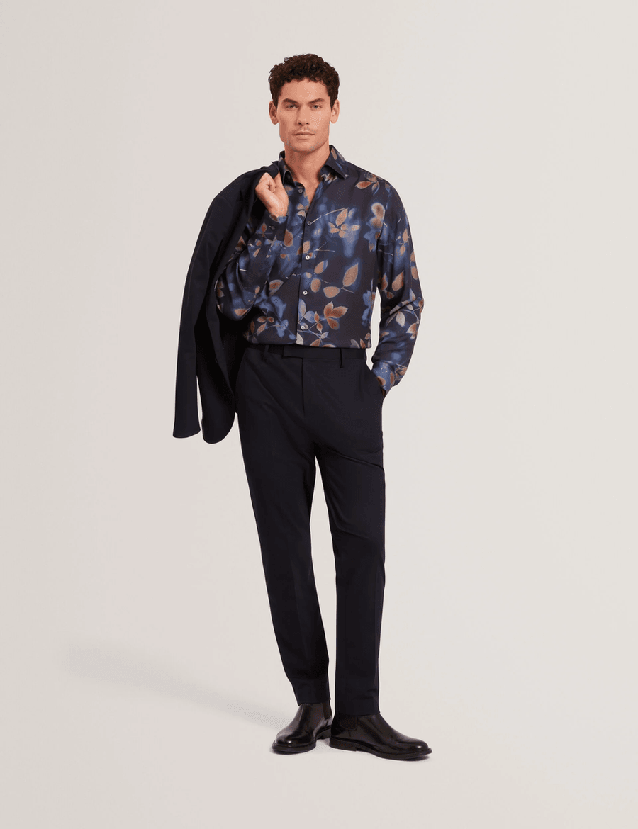 Joe, who is 6'2" / 1.87m, showcases the navy color in a Ted size 3, demonstrating how this shirt fits perfectly on a tall frame. The unique leaf print adds a touch of nature-inspired elegance, making it a standout choice in any closet.