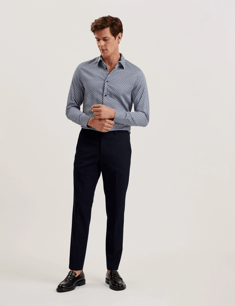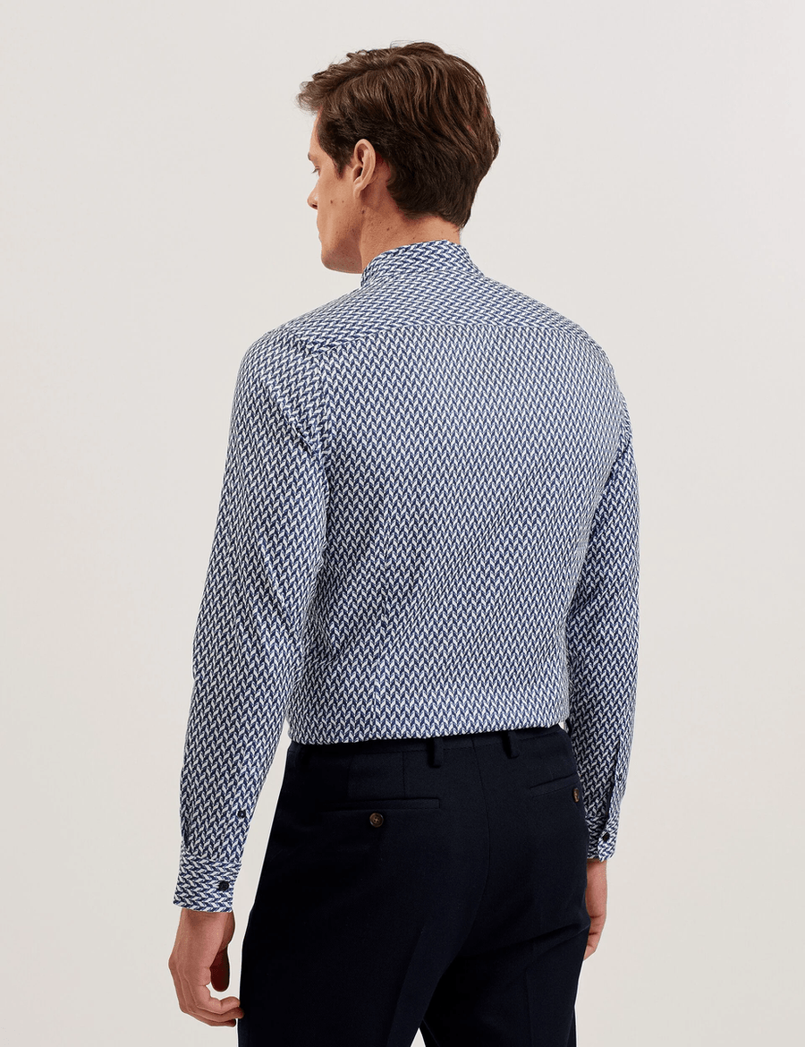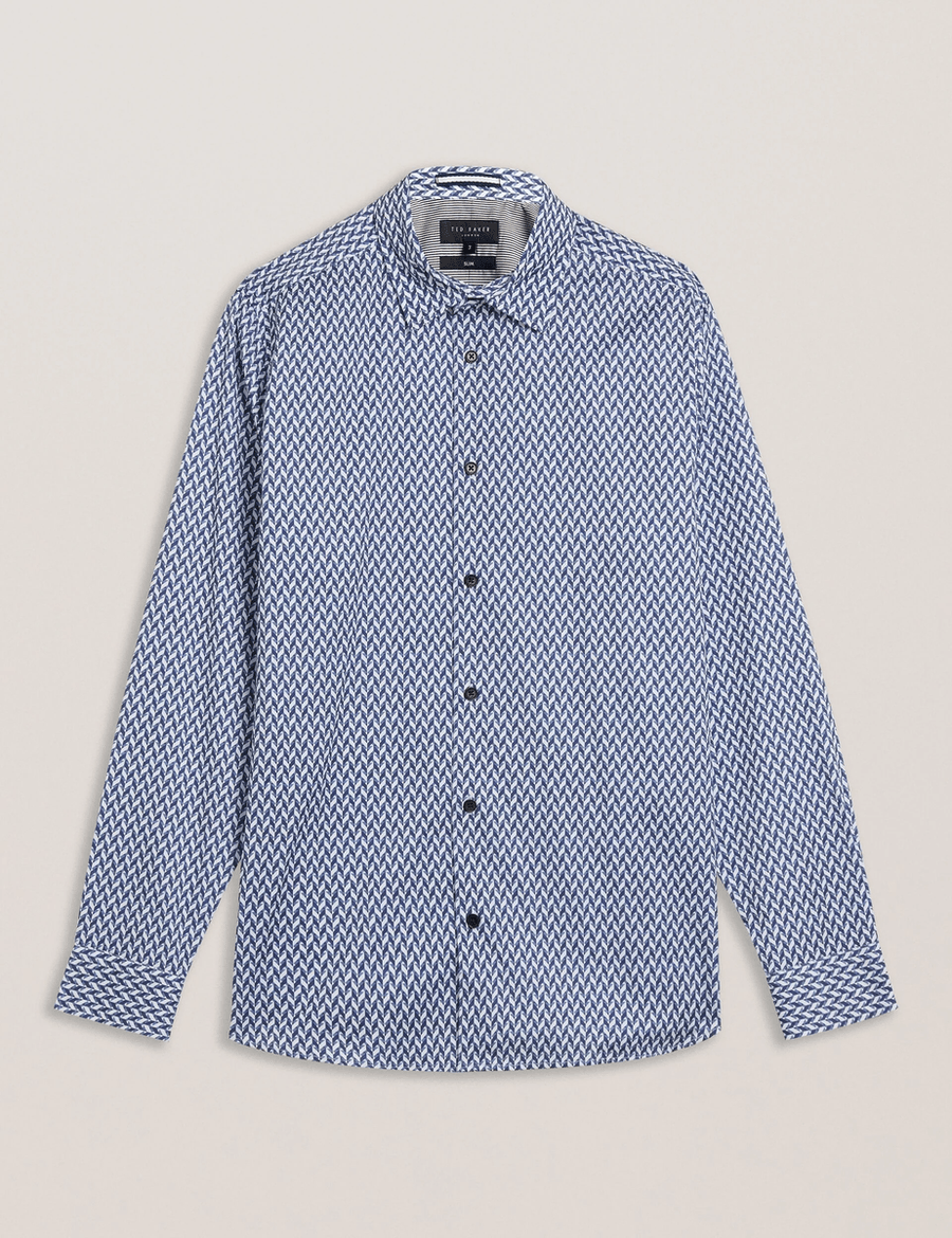 Discover the perfect blend of sophistication and comfort with the Ted Baker LACEBY | NAVY long sleeve shirt. Designed for the modern man, this slim fit shirt features a striking chevron geometric print that adds a touch of elegance to any outfit. Crafted from a high-quality cotton blend with stretch, it ensures you stay comfortable while looking effortlessly stylish.