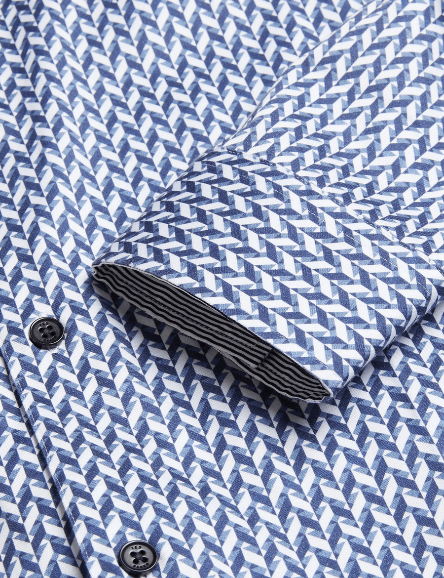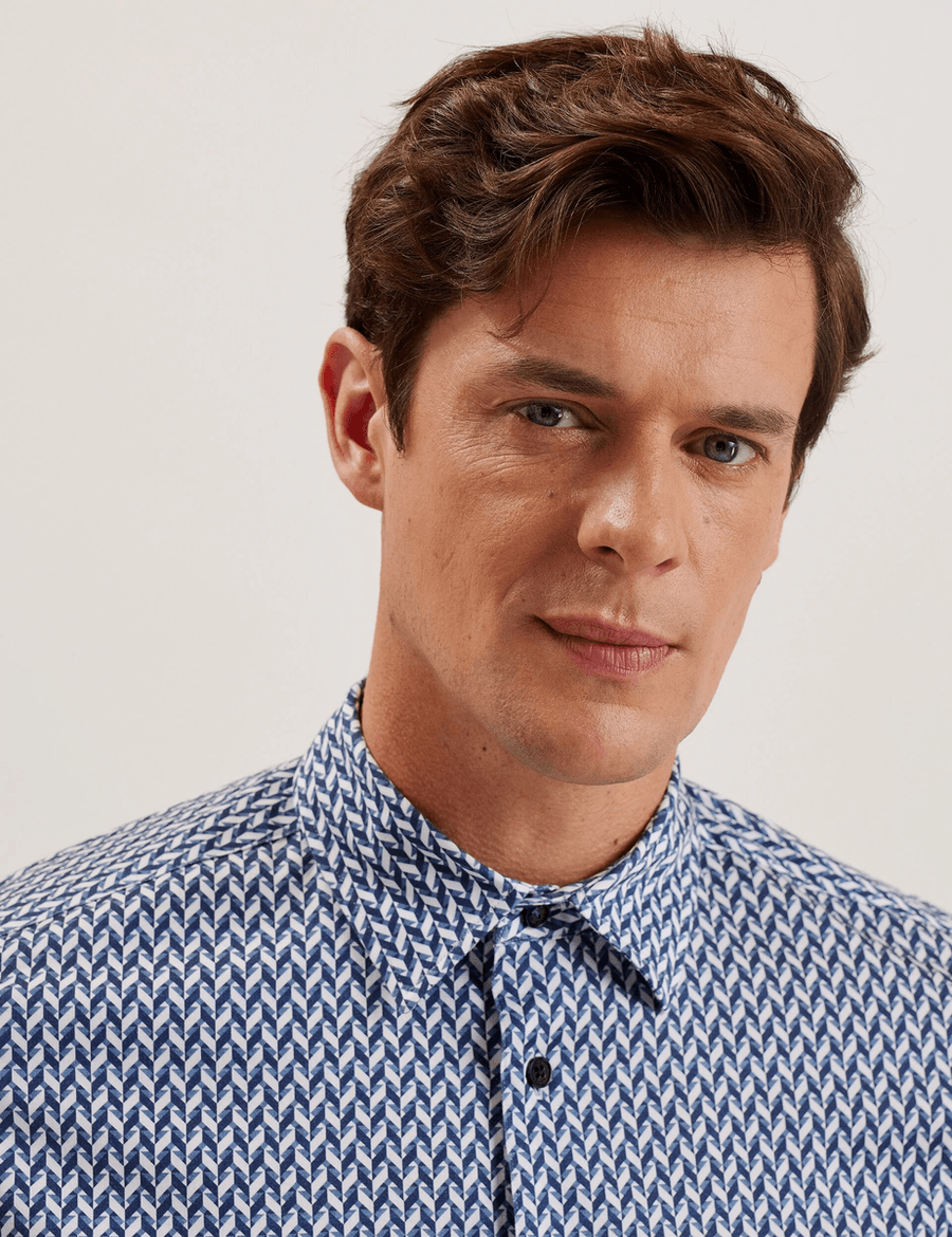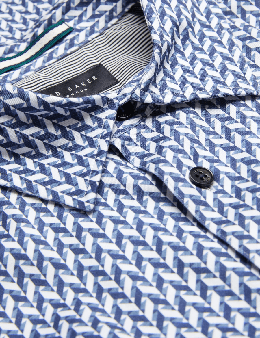 Discover the perfect blend of sophistication and comfort with the Ted Baker LACEBY | NAVY long sleeve shirt. Designed for the modern man, this slim fit shirt features a striking chevron geometric print that adds a touch of elegance to any outfit. Crafted from a high-quality cotton blend with stretch, it ensures you stay comfortable while looking effortlessly stylish.
