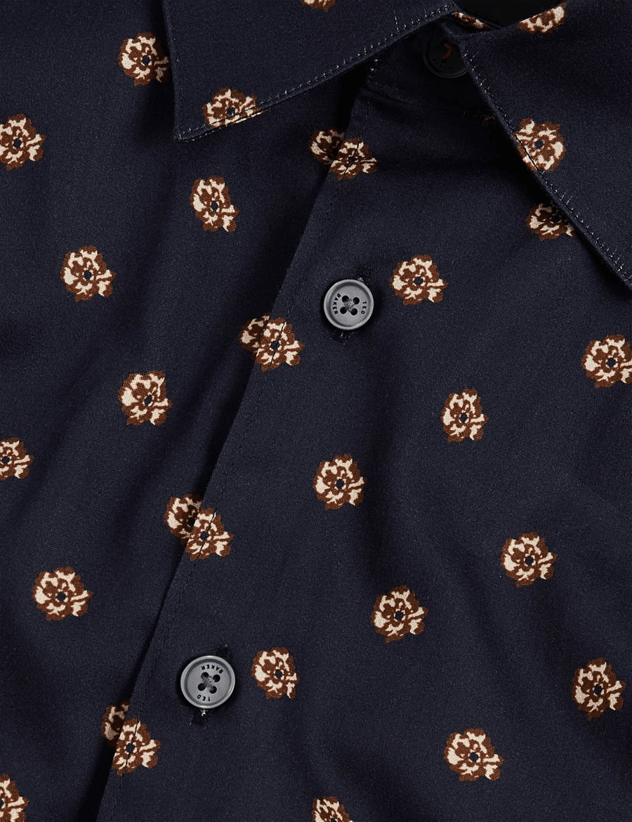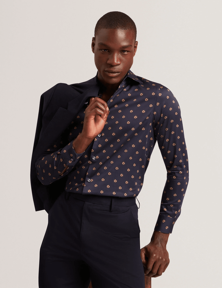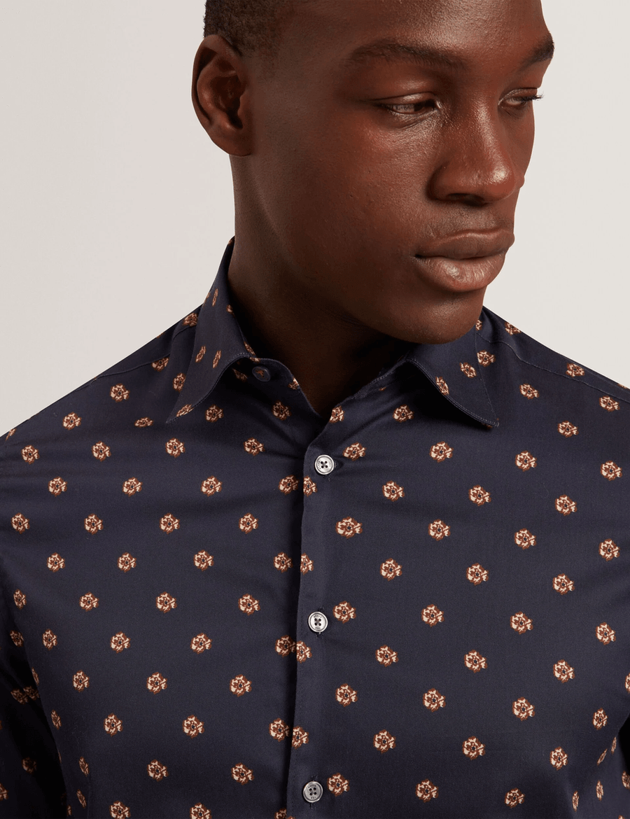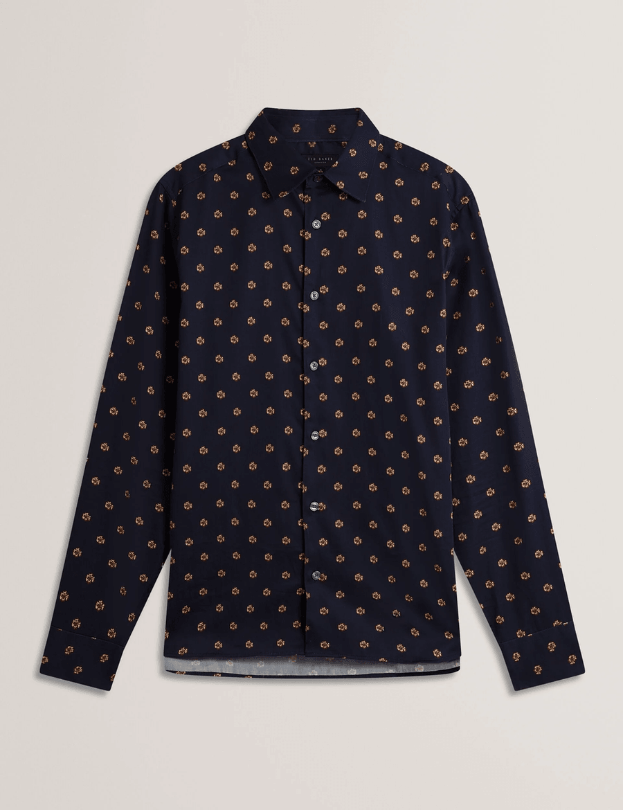 Discover the perfect blend of style and comfort with the Ted Baker OLUFAR | NAVY long sleeve shirt. Featuring a stunning ditsy rose all-over print, this pure woven cotton shirt is an essential addition to any modern man's wardrobe. Whether you’re dressing up for a special occasion or keeping it casual, this shirt offers unmatched versatility.