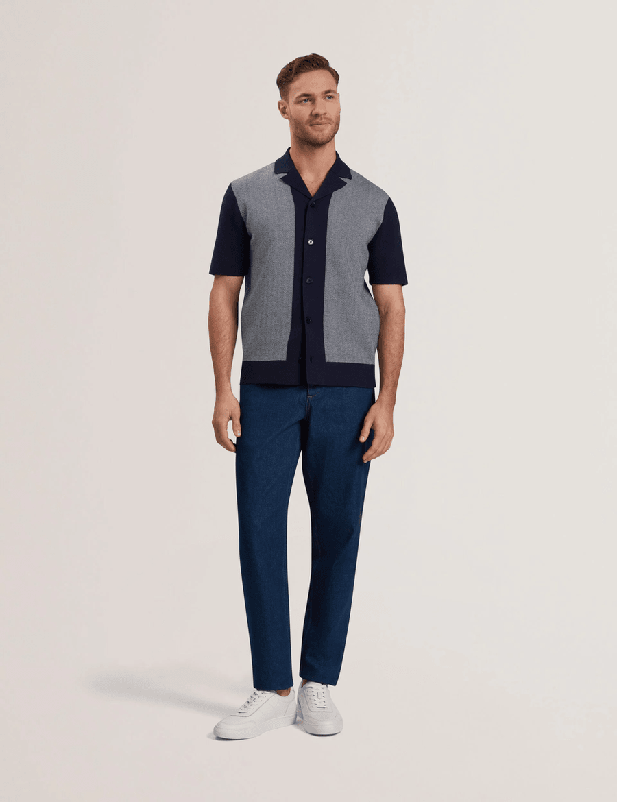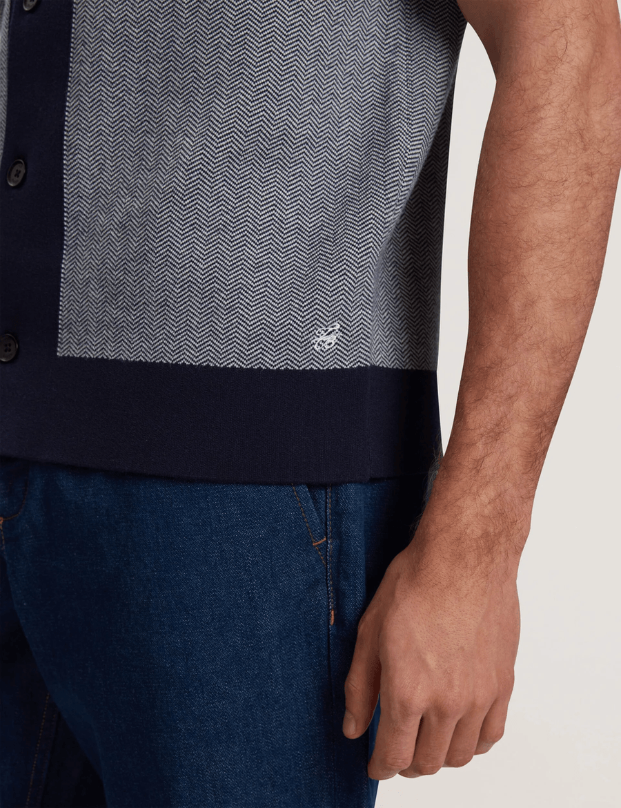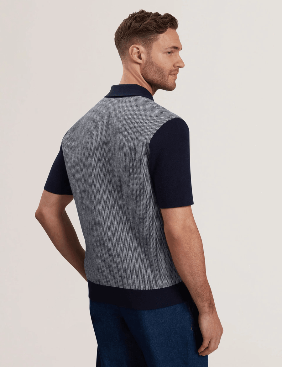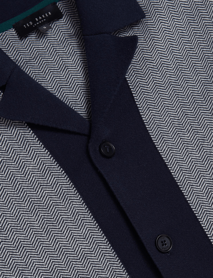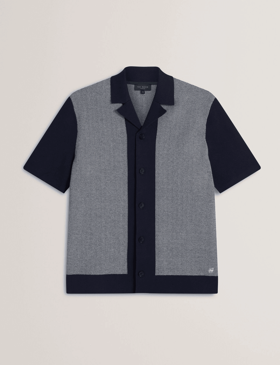 Discover the perfect blend of sophistication and comfort with the Ted Baker PADRIG | NAVY. This short sleeve knitted shirt is designed for the modern man seeking a stylish yet relaxed look. With its unique herringbone texture panels and solid block color trims, this shirt will effortlessly elevate your wardrobe.