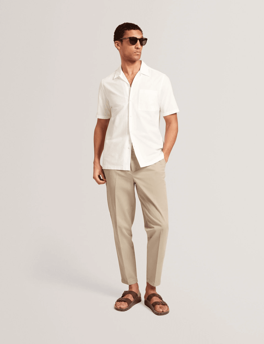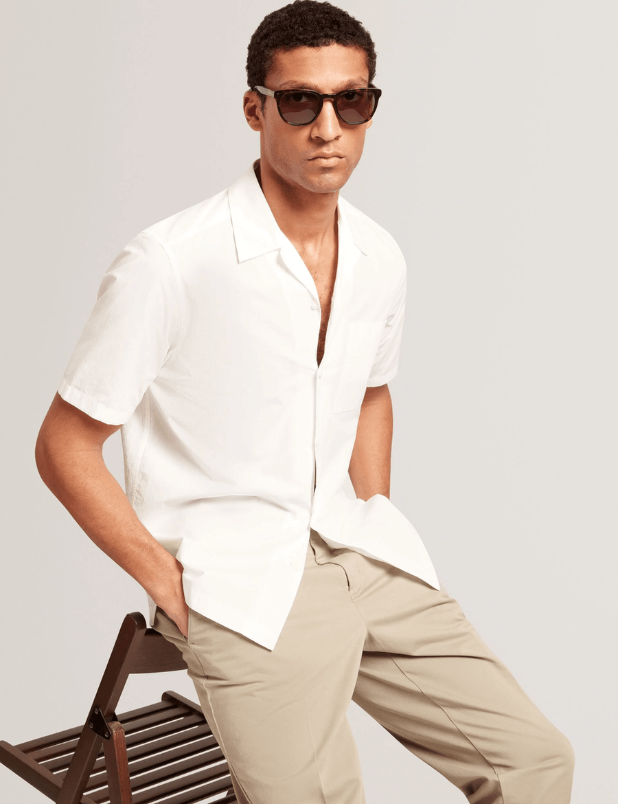 Whether you're heading to a summer BBQ or a weekend brunch, this shirt pairs effortlessly with shorts or tailored trousers. Model Yann, standing at 6'1.5" (1.87m), showcases the shirt in a Ted size 3, emphasizing its stylish fit and contemporary appeal.