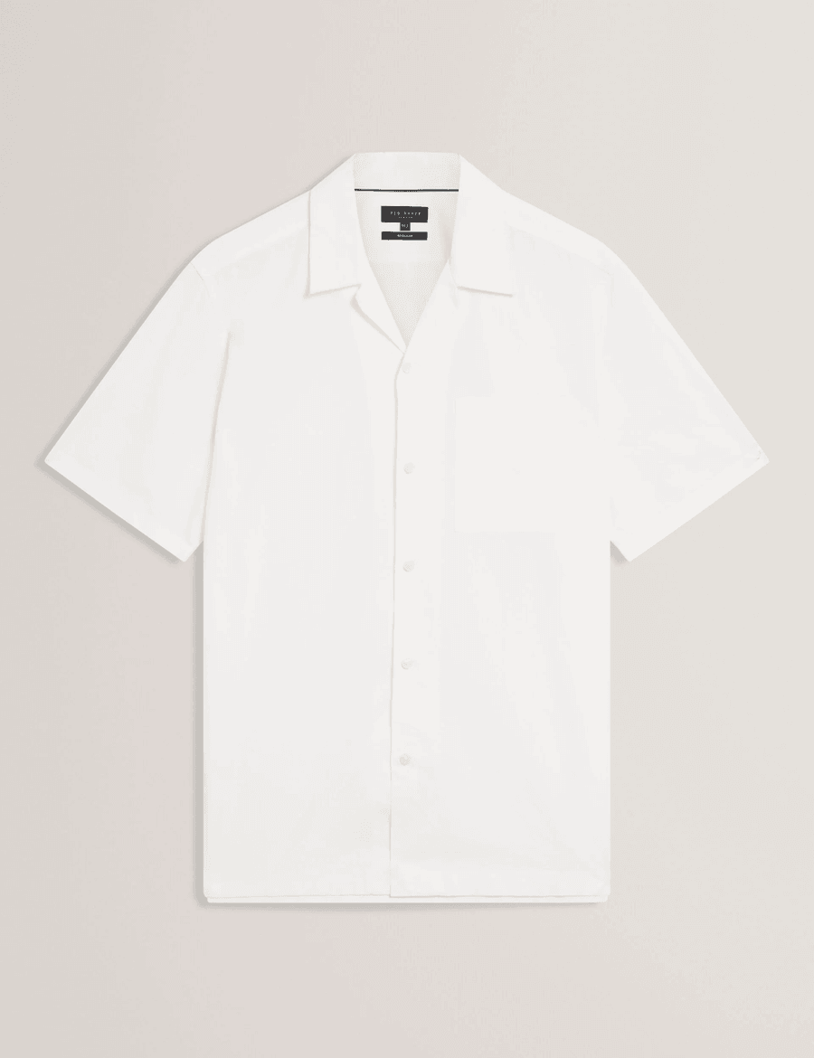 The Ted Baker RADCLYF | WHITE short sleeve shirt features a classic Cuban collar, making it perfect for both casual outings and smart-casual events. With a button fastening and a regular fit, it drapes comfortably on the body, ensuring ease of movement.