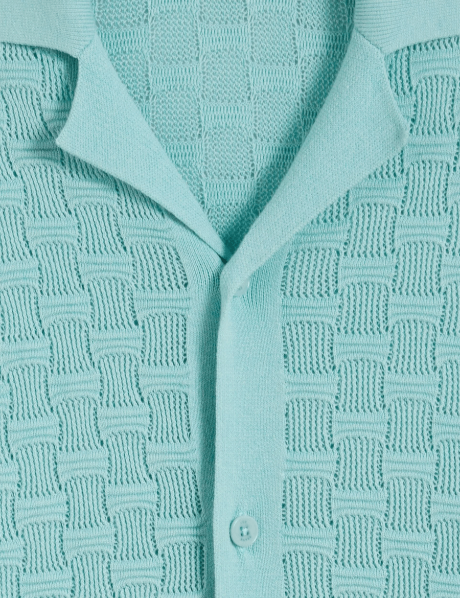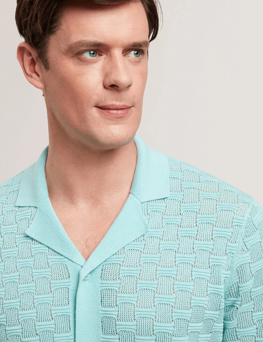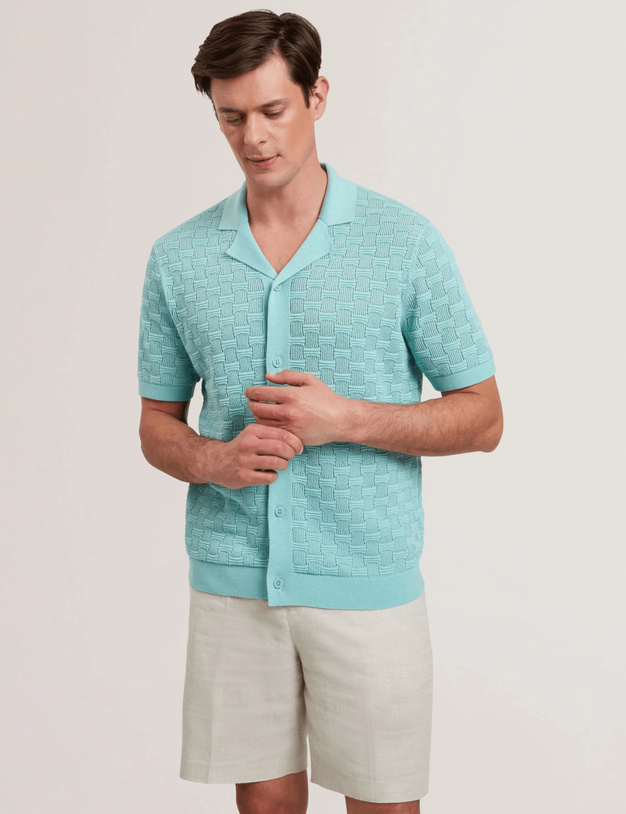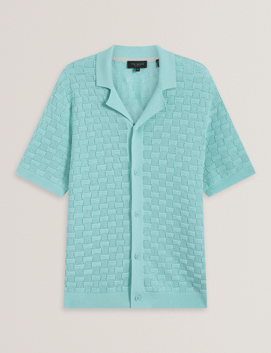 Discover the perfect blend of style and comfort with the Ted Baker RIDGES | PL-GREEN. This short sleeve shirt is crafted from a luxurious silk-cotton knit, featuring a unique textured geometric pattern that sets you apart in any setting. Whether you're dressing up for a night out or keeping it casual, this shirt is a must-have addition to your collection.