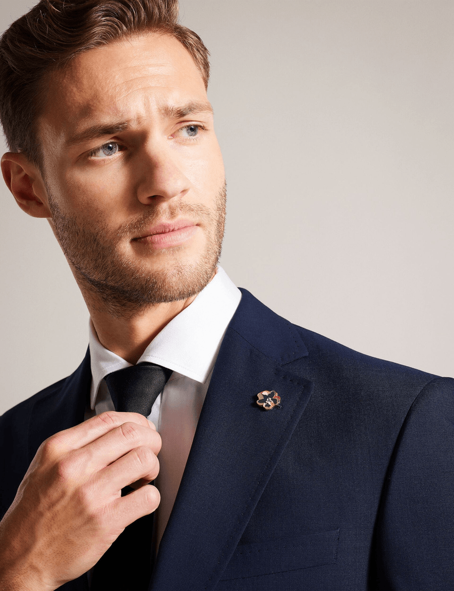 The Ted Baker CLASSIC | MID-BLUE jacket stands out with its traditional two-button fastening and notch lapel, making it a staple in any gentleman's wardrobe. The magnolia pin design adds a touch of elegance, while the jacquard lining enhances the overall aesthetic. Whether you choose to wear it with matching trousers for a complete suit or mix it up with chinos for a more casual vibe, this jacket adapts to your style.