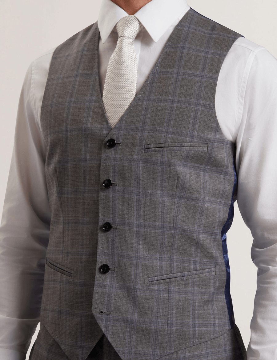 Introducing the Ted Baker RONAV | LT-GREY, a stunning addition to your formal wardrobe. This expertly crafted suit vest showcases a sophisticated grey wool fabric, beautifully accented with a striking blue windowpane check. Perfect for those who appreciate a tailored fit, this vest effortlessly transforms your look.
