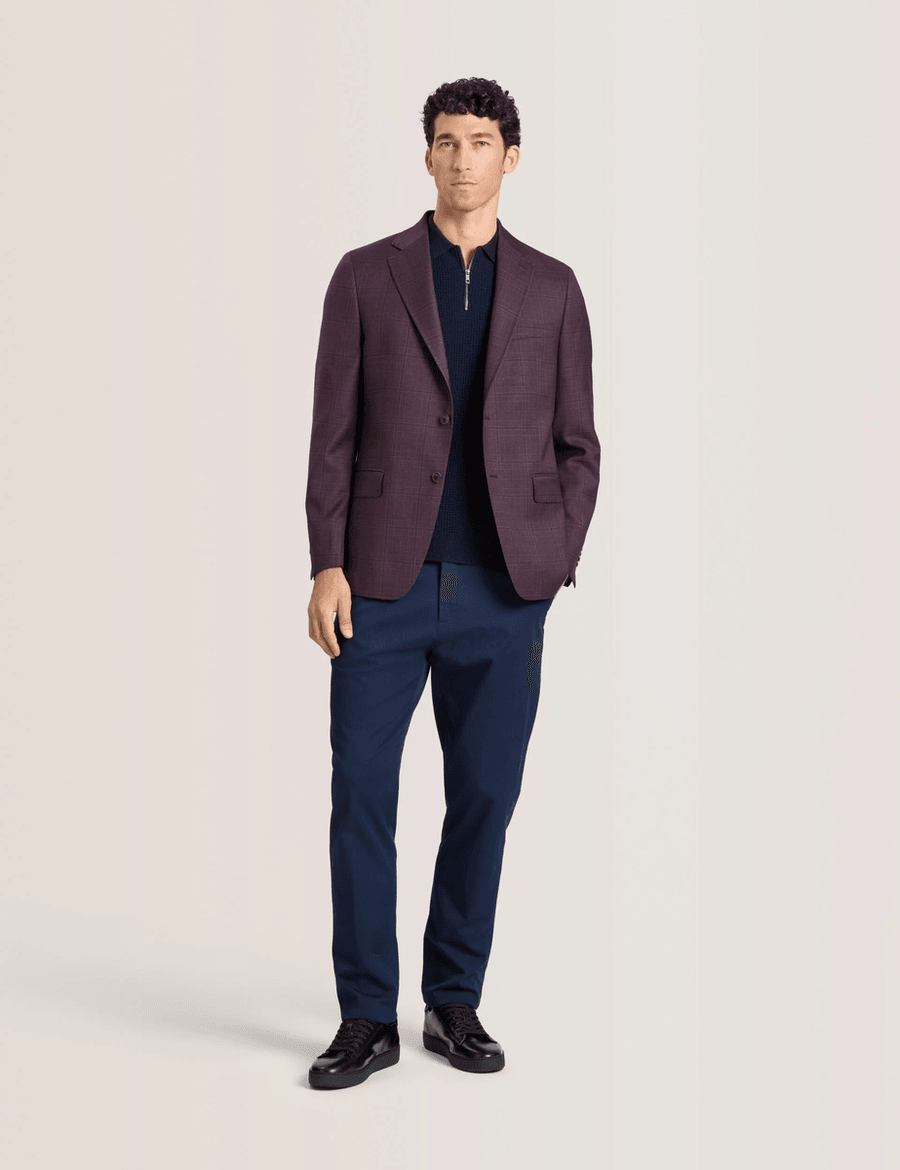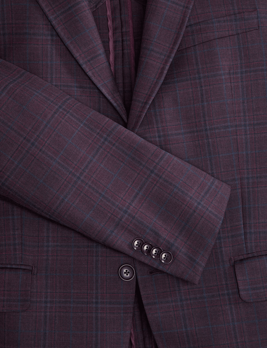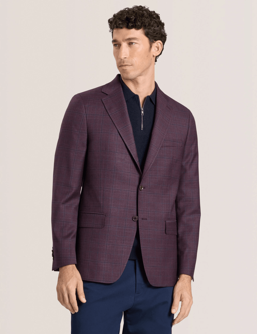 With its sophisticated burgundy check pattern, this suit jacket stands out as a fashionable choice that pairs effortlessly with a range of trousers. Whether you're attending a business meeting or a special event, this jacket promises to elevate your look. The notched lapels and classic single-breasted design ensure that you remain timelessly stylish.