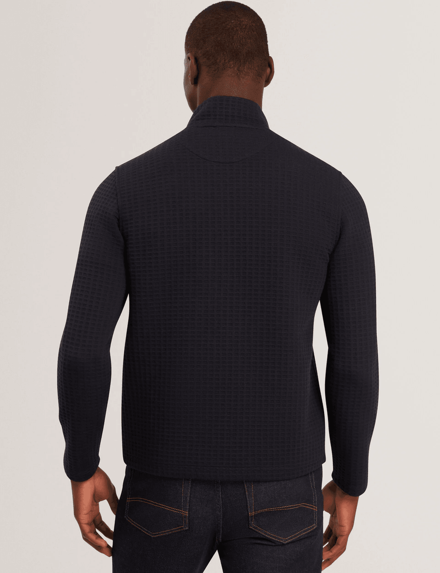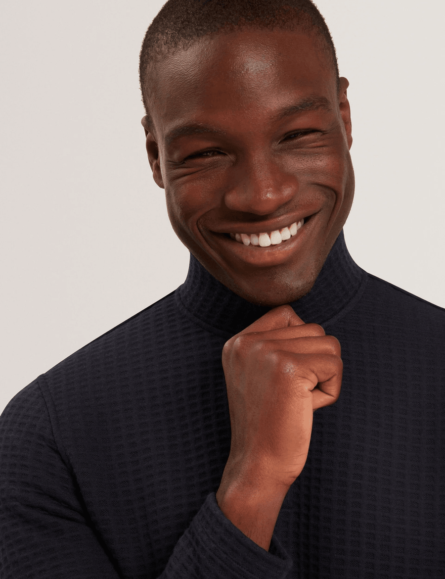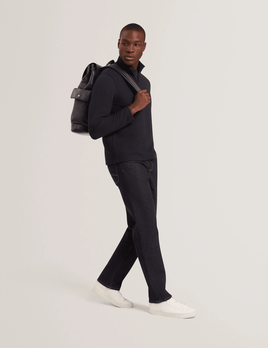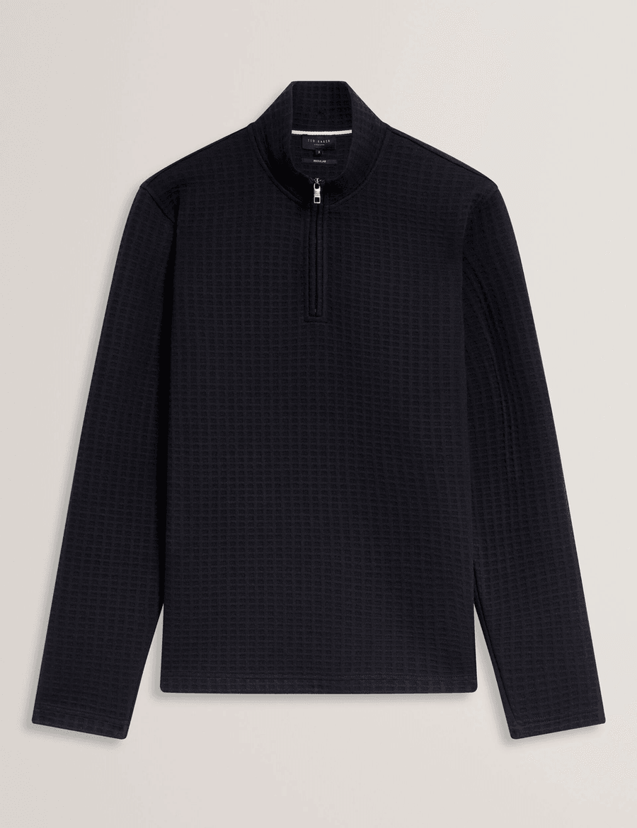 Introducing the Ted Baker CAINDLE in Navy, the perfect blend of style and comfort for effortless layering. This versatile knit sweatshirt features a quarter-zip neck and a unique waffle texture, making it an essential addition to your wardrobe.