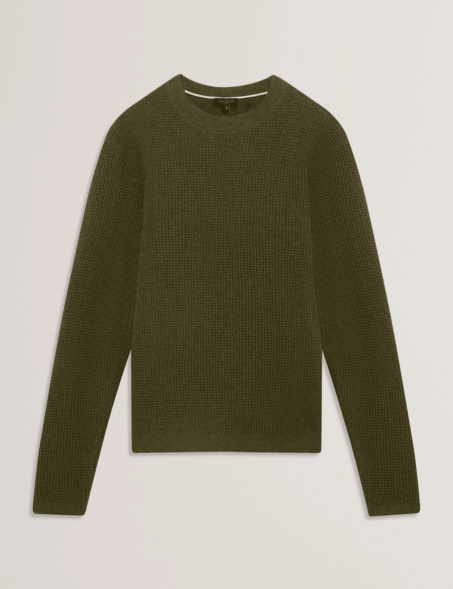 Elevate your fashion game with the stunning Ted Baker CLACX | OLIVE. This long sleeve jumper combines a luxurious waffle texture knit with a warm wool blend fabric, designed to keep you cozy while looking effortlessly chic.
