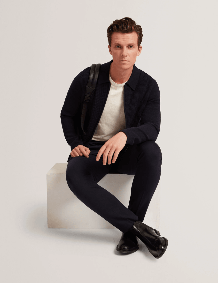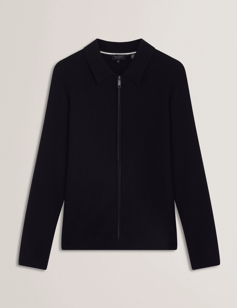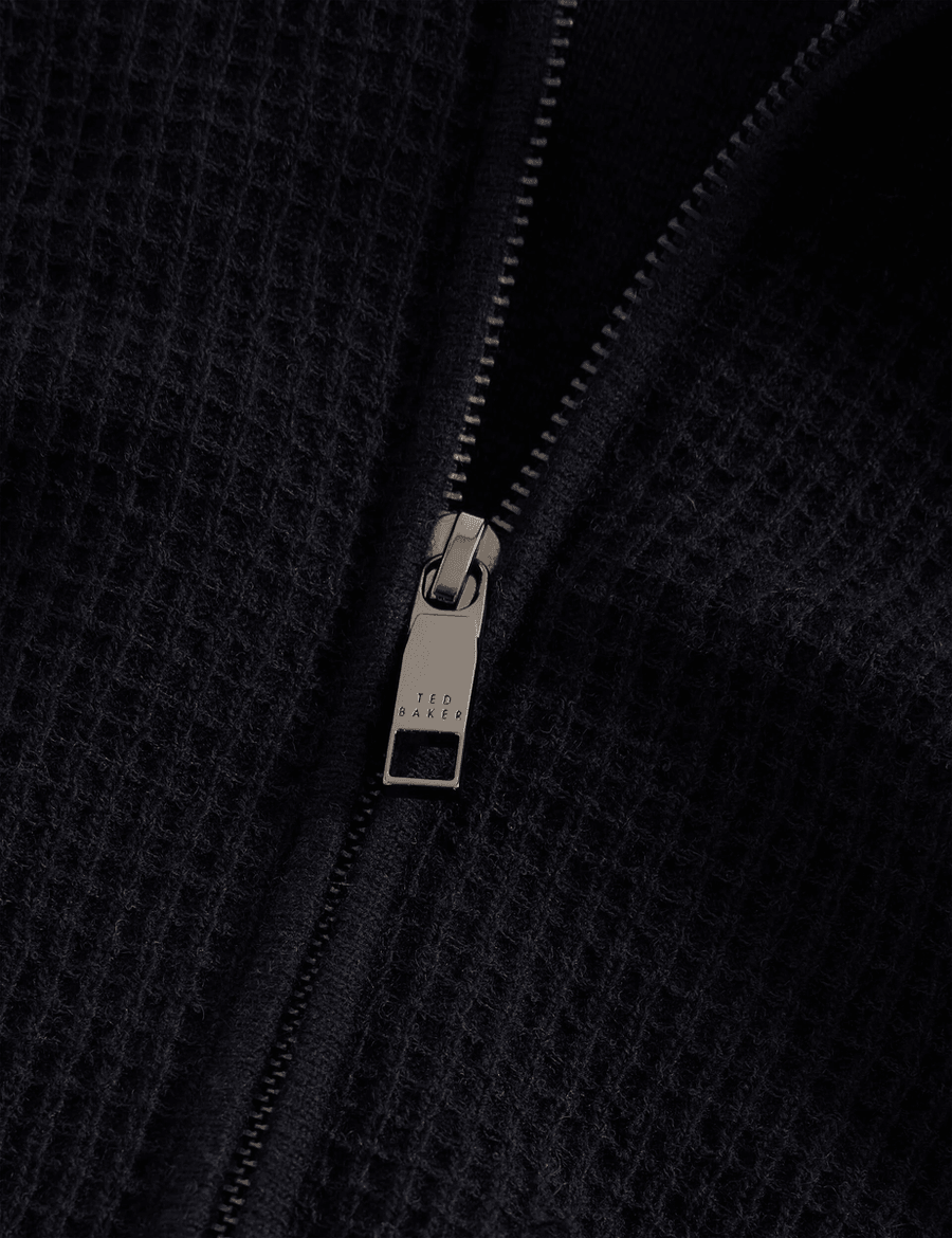 Discover timeless elegance with the Ted Baker FENRYS | NAVY, a long sleeve jumper that redefines classic sophistication. This stylish piece features a zip-through design and a unique waffle texture front panel, making it an essential addition to your wardrobe.