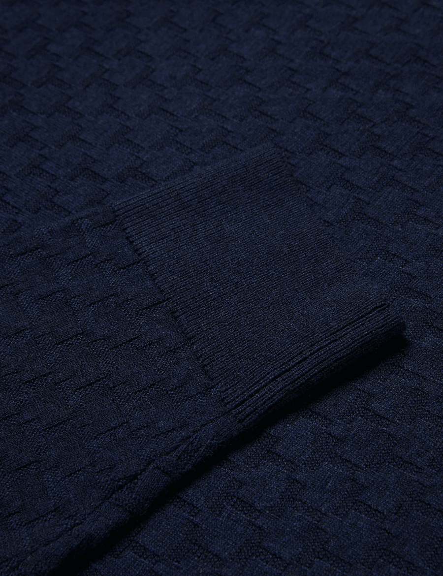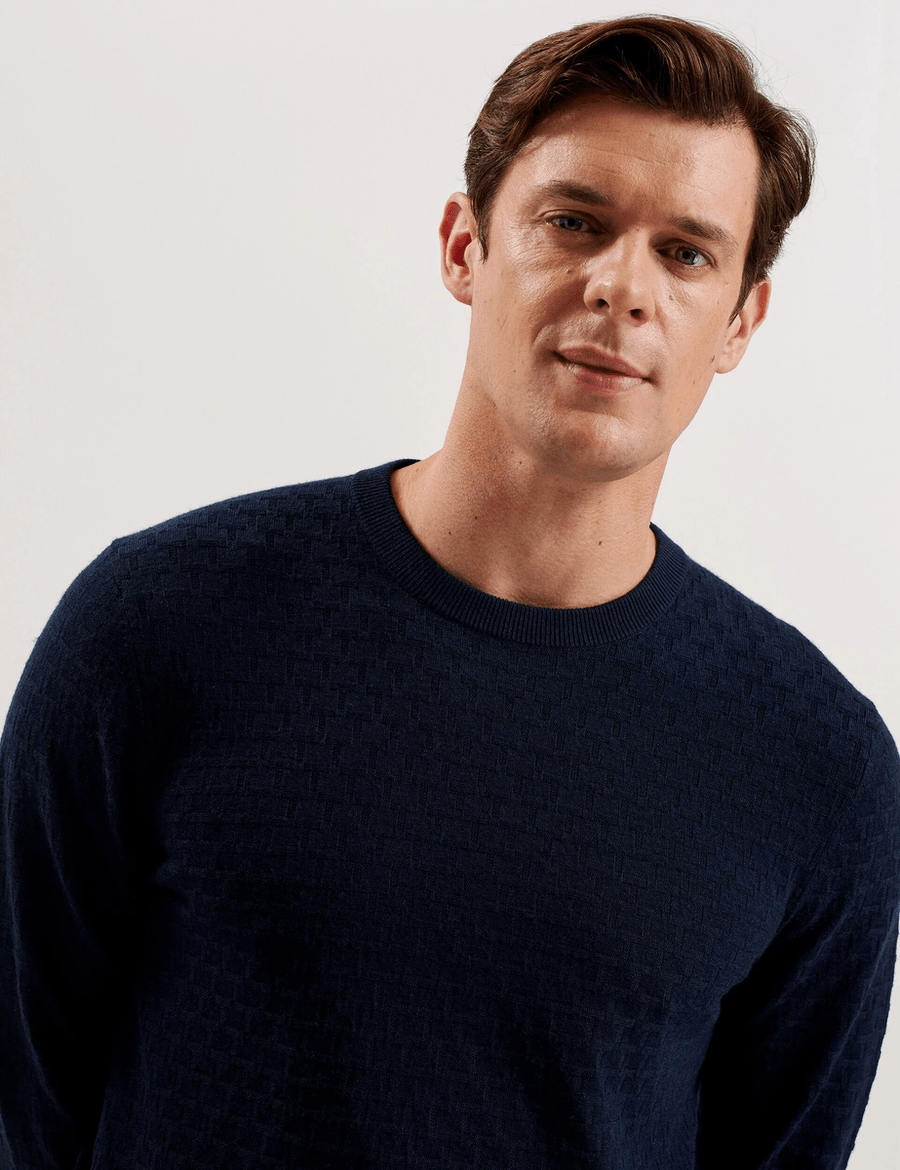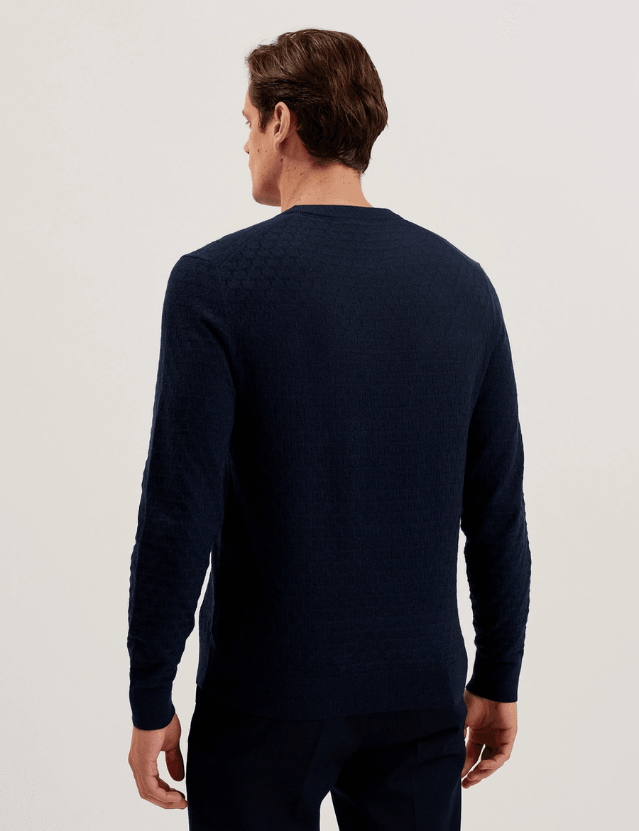 The Ted Baker LOUNG | NAVY jumper is not just a piece of clothing; it’s a statement of style. With its elegant textured T-pattern, it offers a sophisticated touch to your ensemble. Model Lewis, standing at 6'2" (1.88m), showcases the perfect fit in a Ted size 3, highlighting its tailored design that flatters all body types.