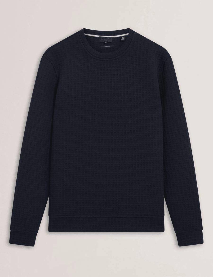 Discover the perfect blend of comfort and style with the Ted Baker ORLAITE | NAVY. This long sleeve sweatshirt features a unique waffle texture that adds a touch of sophistication to your casual wardrobe. Crafted from a comfortable knit fabric, it ensures you stay cozy without sacrificing style.