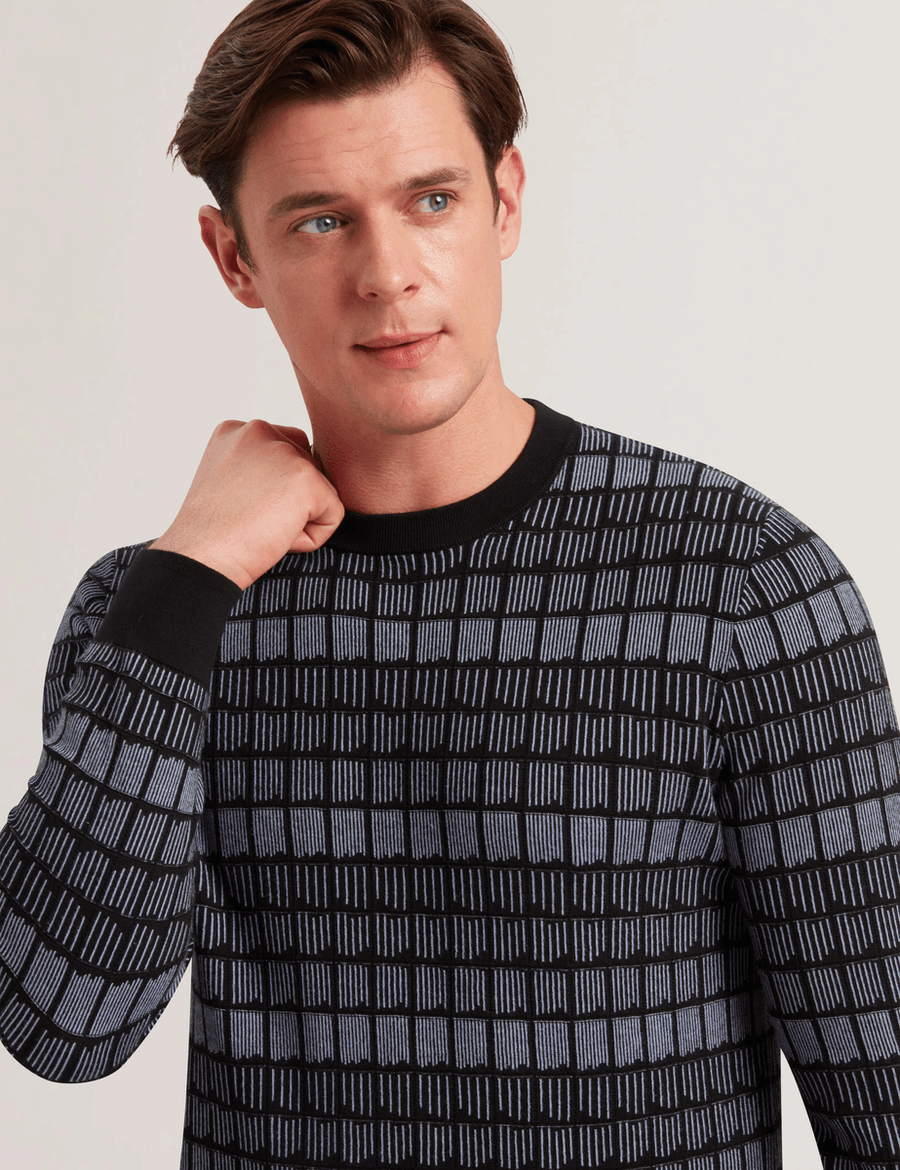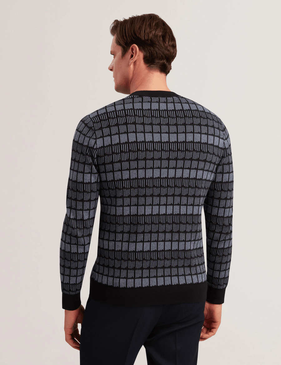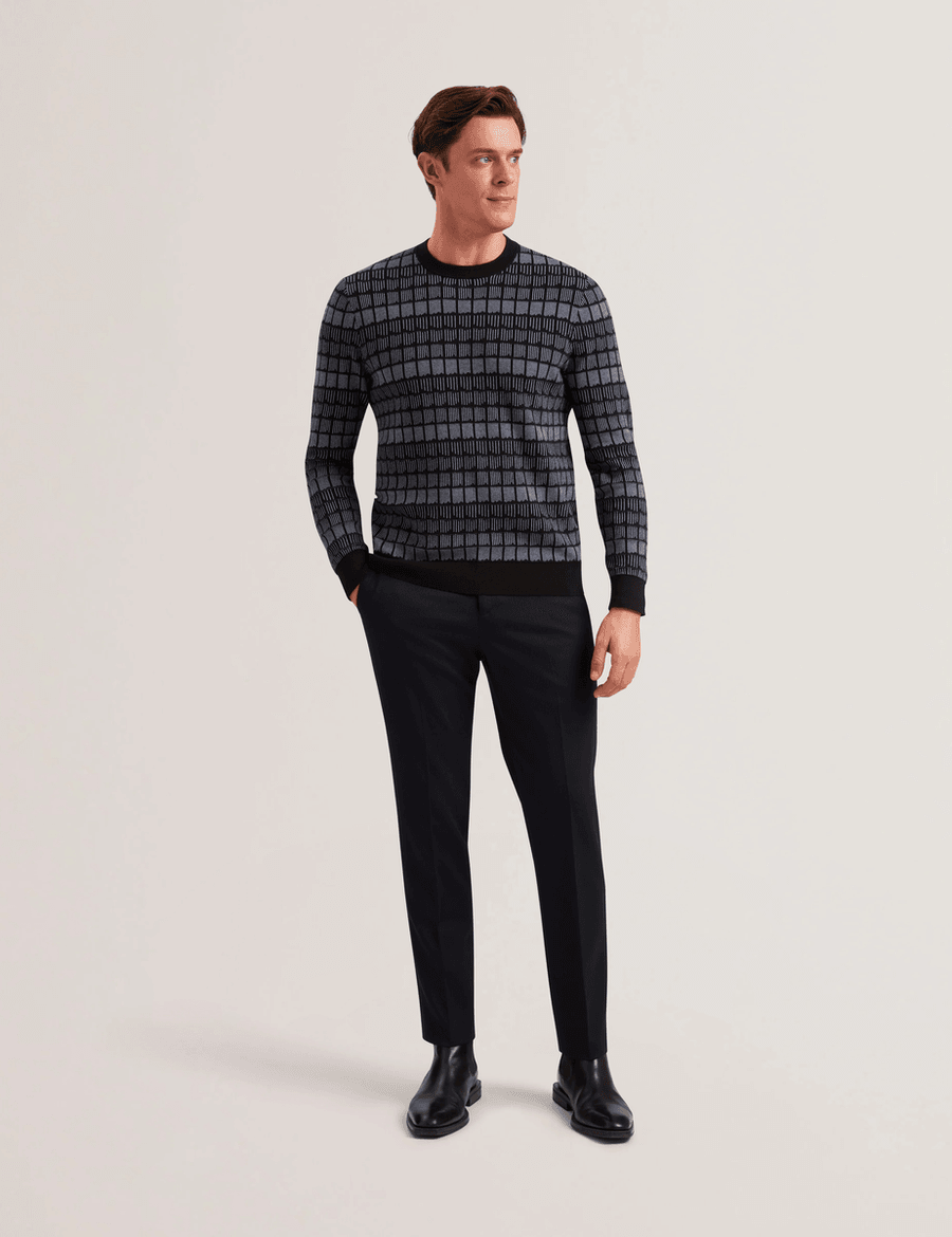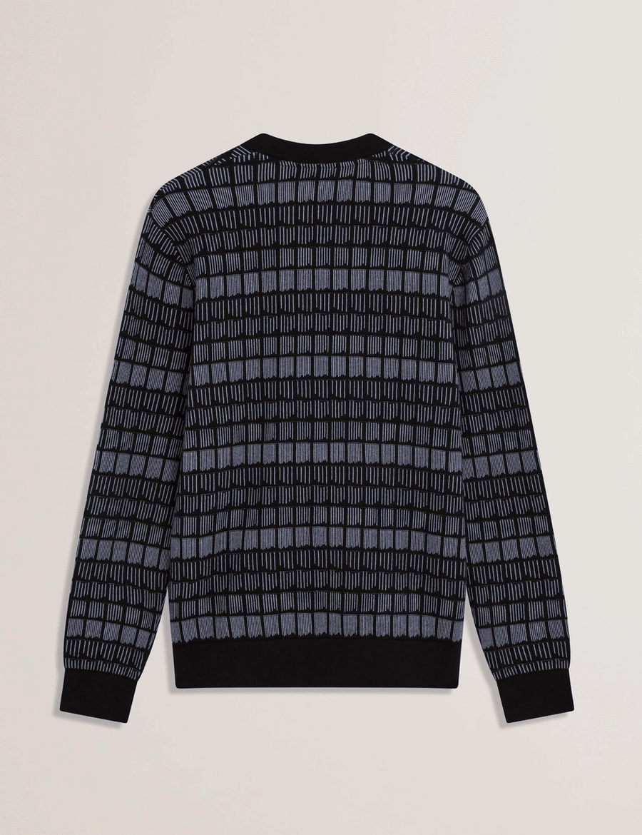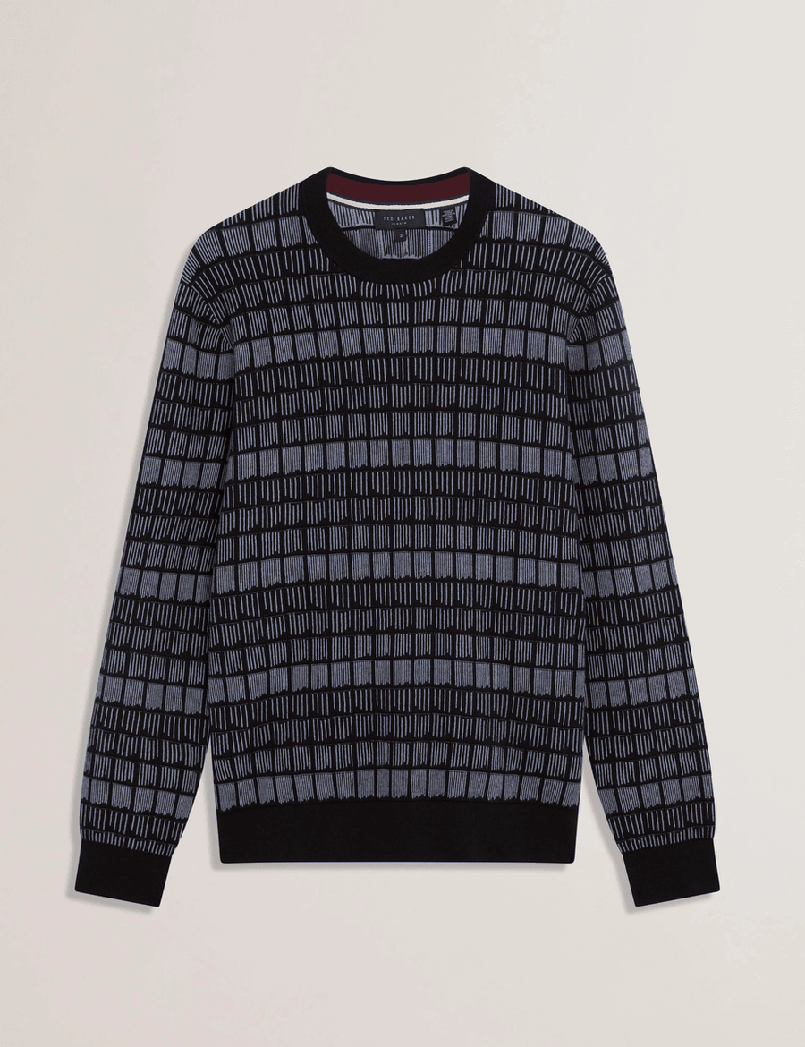 Introducing the Ted Baker OSBURN | BLACK, a standout piece designed for those who dare to be bold. This crew neck jumper features a stunning ombre grid design that adds a unique textured look to your wardrobe.