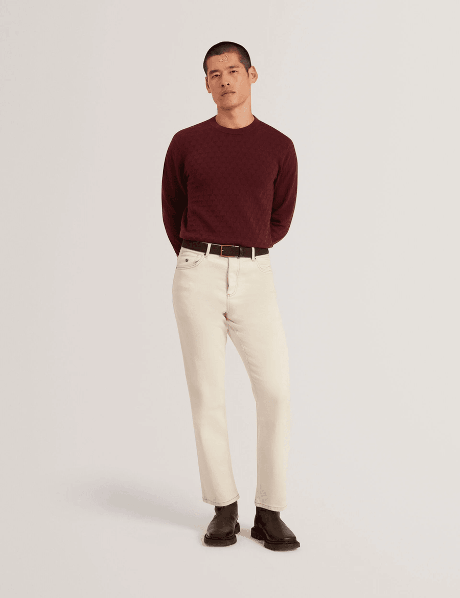 The Ted Baker SAINSY | MAROON jumper is your go-to choice for stylish layering. With its all-over branded texture, this jumper adds a touch of sophistication to both casual and formal outfits. Matt, who is 6'2" (1.87m), models a size 3, showcasing how this jumper complements a tall frame beautifully.