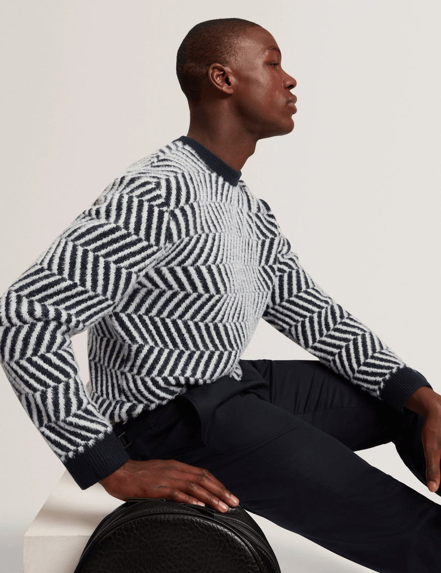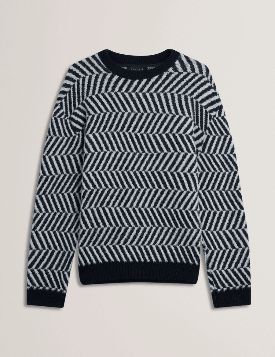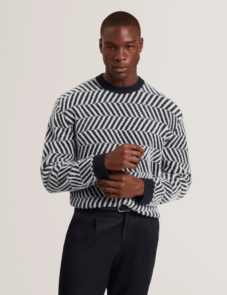 Discover the ultimate blend of style and comfort with the Ted Baker SERGEJ | NAVY long sleeve jumper. This chic piece features a unique two-tone zig-zag pattern that adds a modern twist to your everyday look. Perfect for layering or wearing solo, it’s crafted from a cozy wool blend that promises warmth without compromising on style.