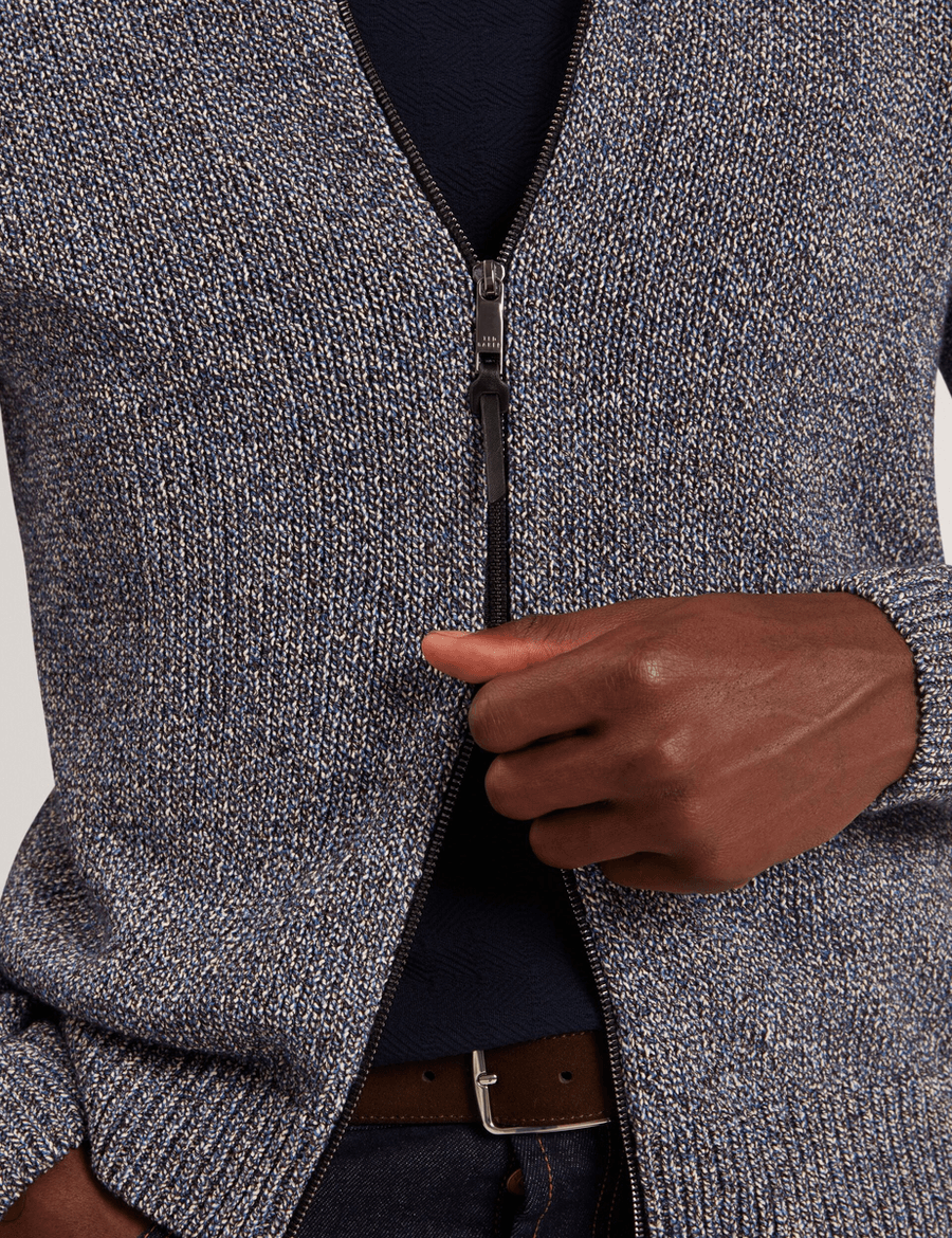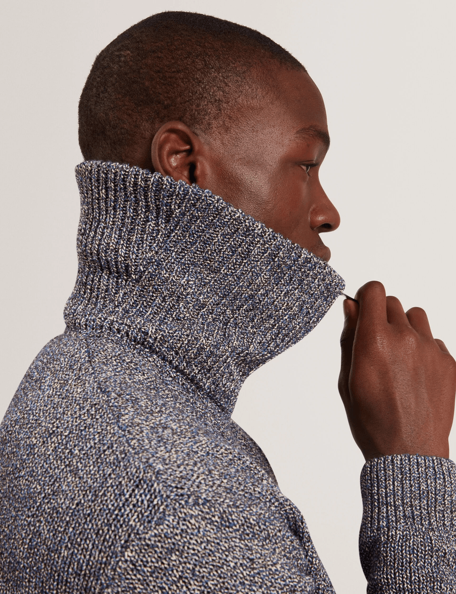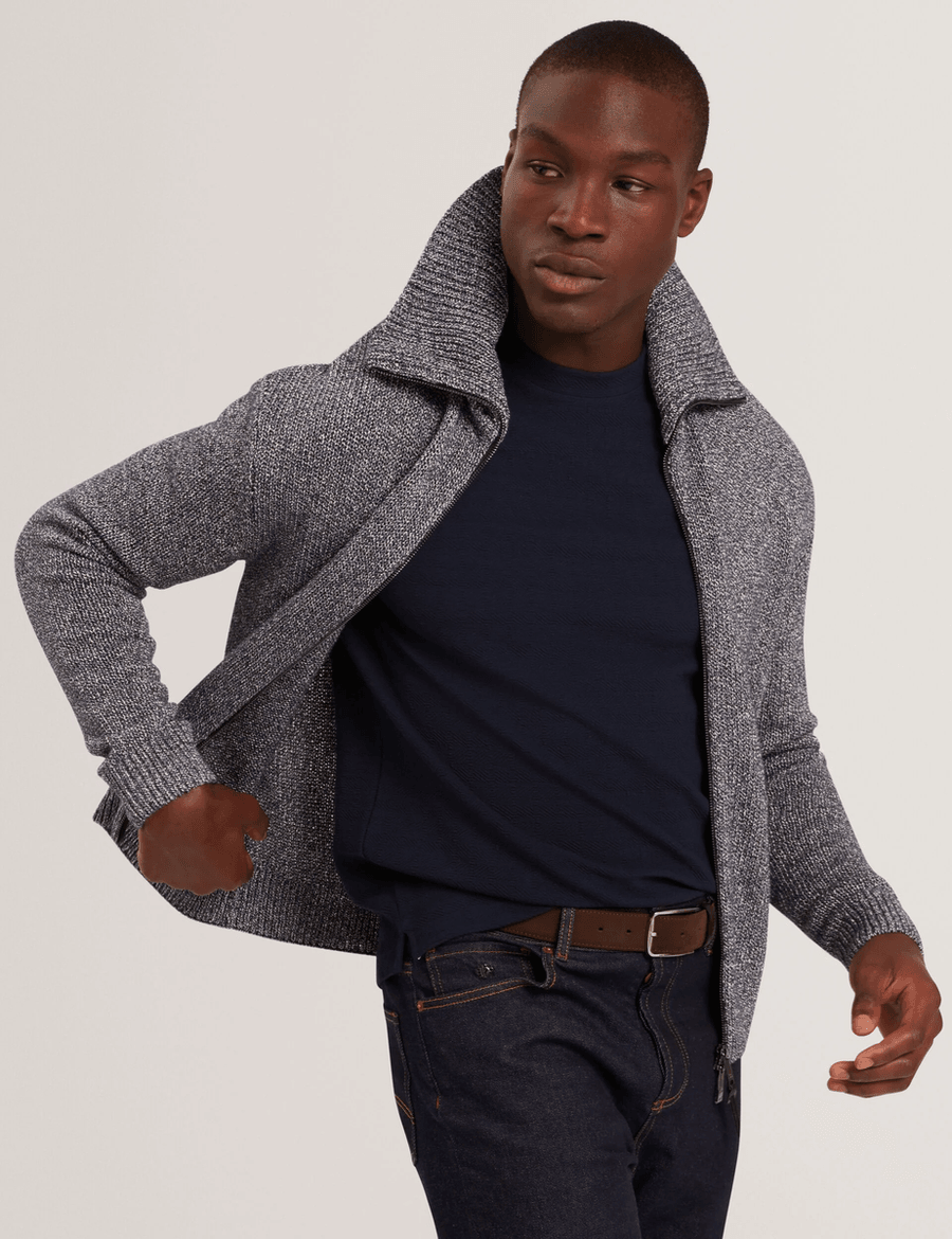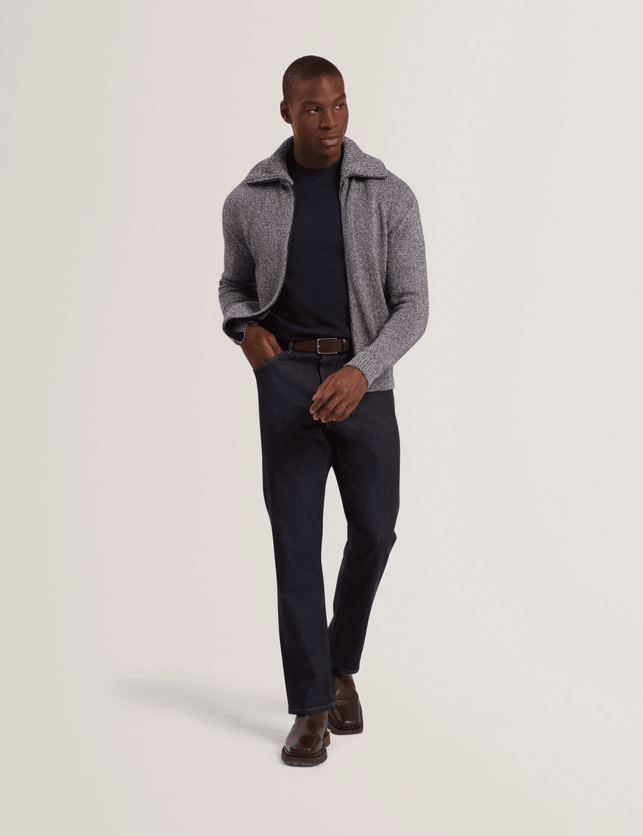 With a modern funnel neck collar and convenient zip-through design, the VARINK is perfect for layering over tees or under jackets. Chris, who stands at 6'2" (1.87m), wears a Ted size 3, showcasing how this jumper fits perfectly on different body types.