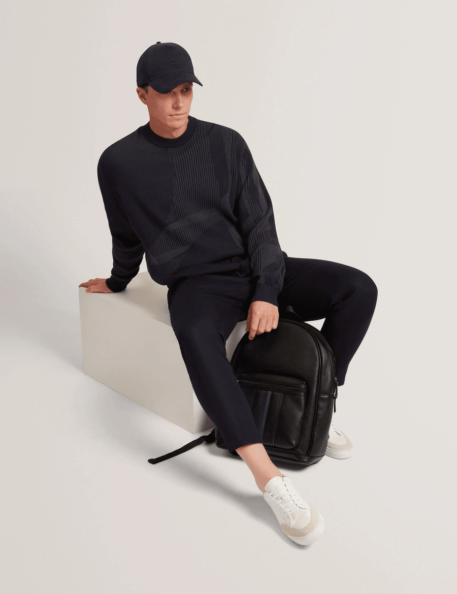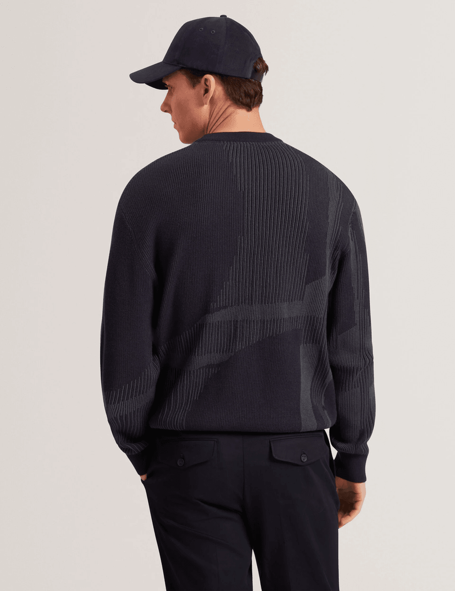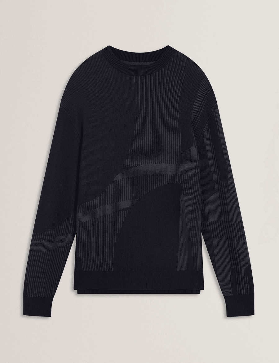 Discover the perfect blend of comfort and style with the Ted Baker WILAN | NAVY long sleeve jumper. Designed for those who appreciate modern fashion, this jumper features a tonal abstract graphic that adds a unique flair to your wardrobe. Crafted with a ribbed texture knit, it guarantees warmth and sophistication for any occasion.