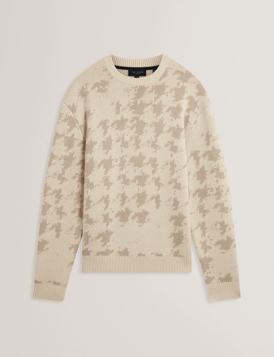 Discover the ultimate blend of style and comfort with the Ted Baker ZENDAYD | ECRU. This long sleeve jumper features a unique faded houndstooth check print, making it a standout piece for any occasion. Crafted from a heavyweight knit wool blend, it promises warmth and durability throughout the colder months.