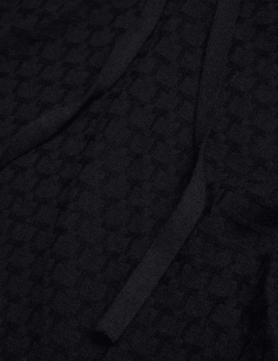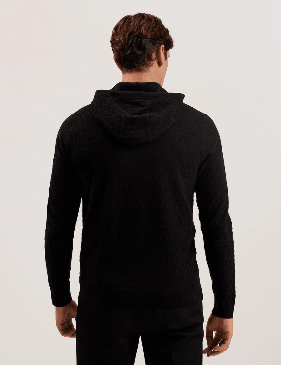 The Ted Baker LOULAR | BLACK hoodie features a chic interlocking textured pattern that stands out in any crowd. With its adjustable neck drawcords, you can easily modify the fit to suit your style. The ribbed trims not only enhance the design but also provide added durability. Perfect for layering or wearing on its own, this hoodie is versatile enough for both casual outings and cozy nights in.