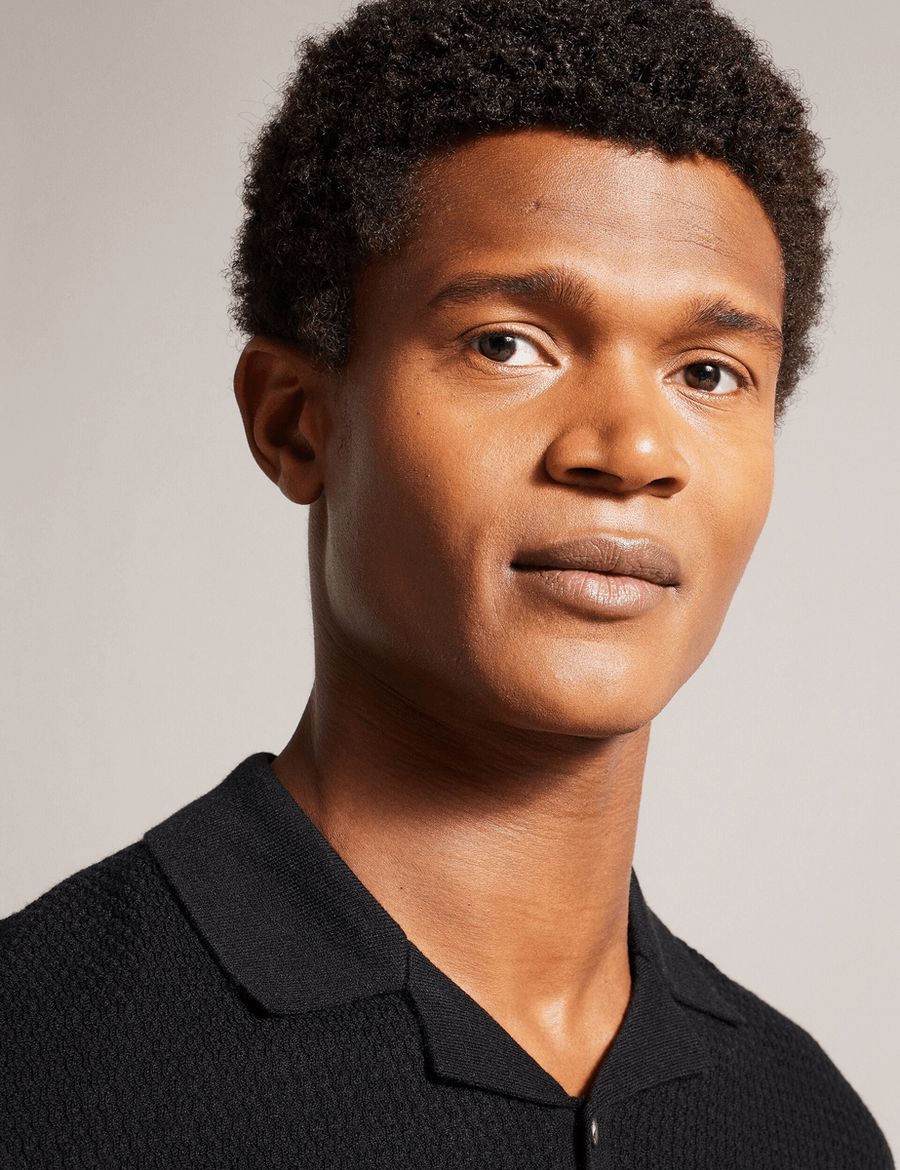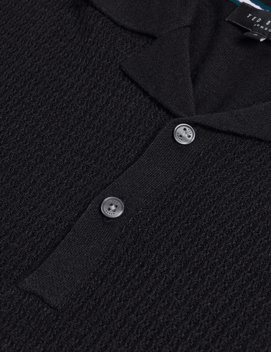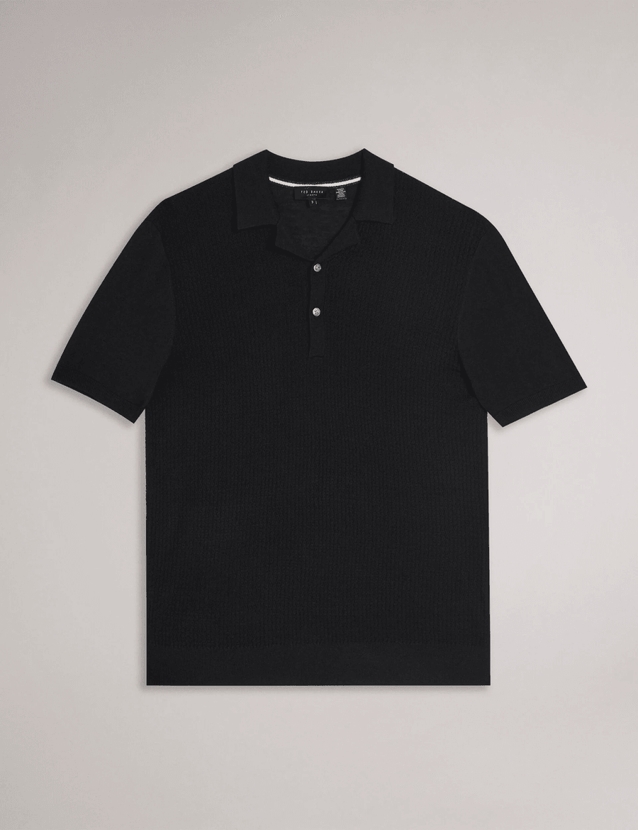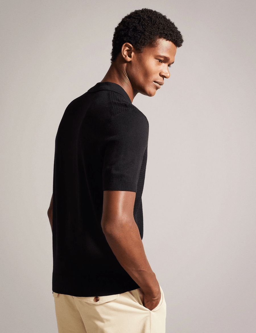 Introducing the Ted Baker ADIO | BLACK, your go-to polo shirt for every occasion. Whether you're taking leisurely dog walks or enjoying a sunny barbecue in the garden, this stylish polo has you covered. With its revere collar and soft wool blend, you’ll experience both comfort and sophistication.
