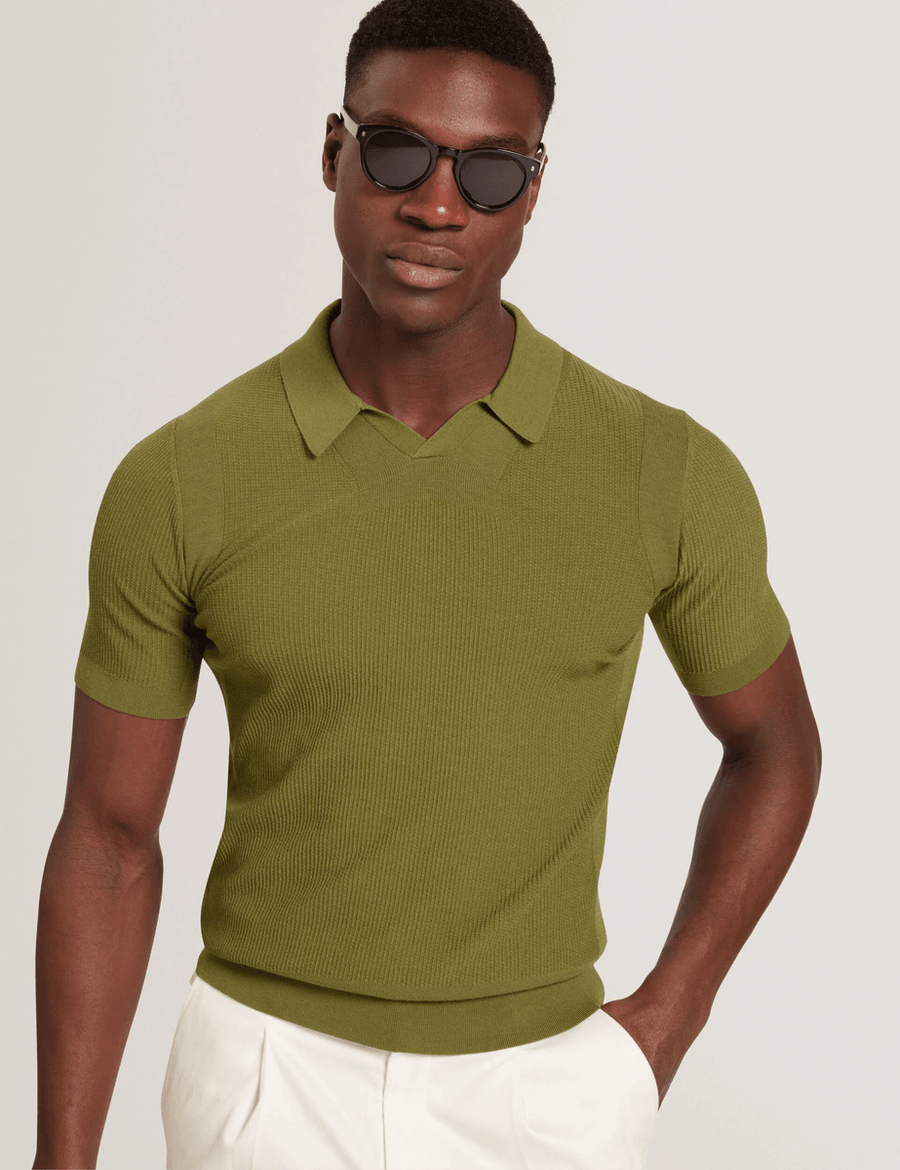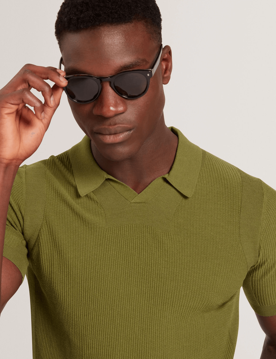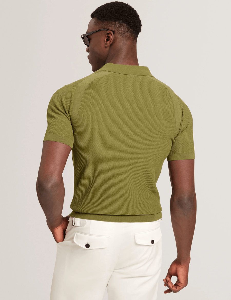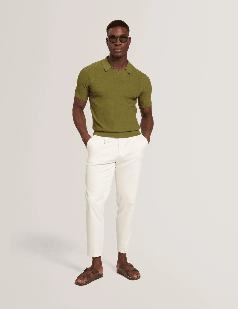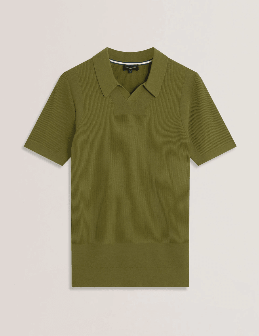 Elevate your wardrobe with the Ted Baker AINDREA | GREEN, a luxurious short sleeve polo shirt that effortlessly combines comfort with sophistication. Crafted from a premium silk blend knitted fabric, this polo offers a unique stitched rib texture that sets it apart from ordinary styles.
