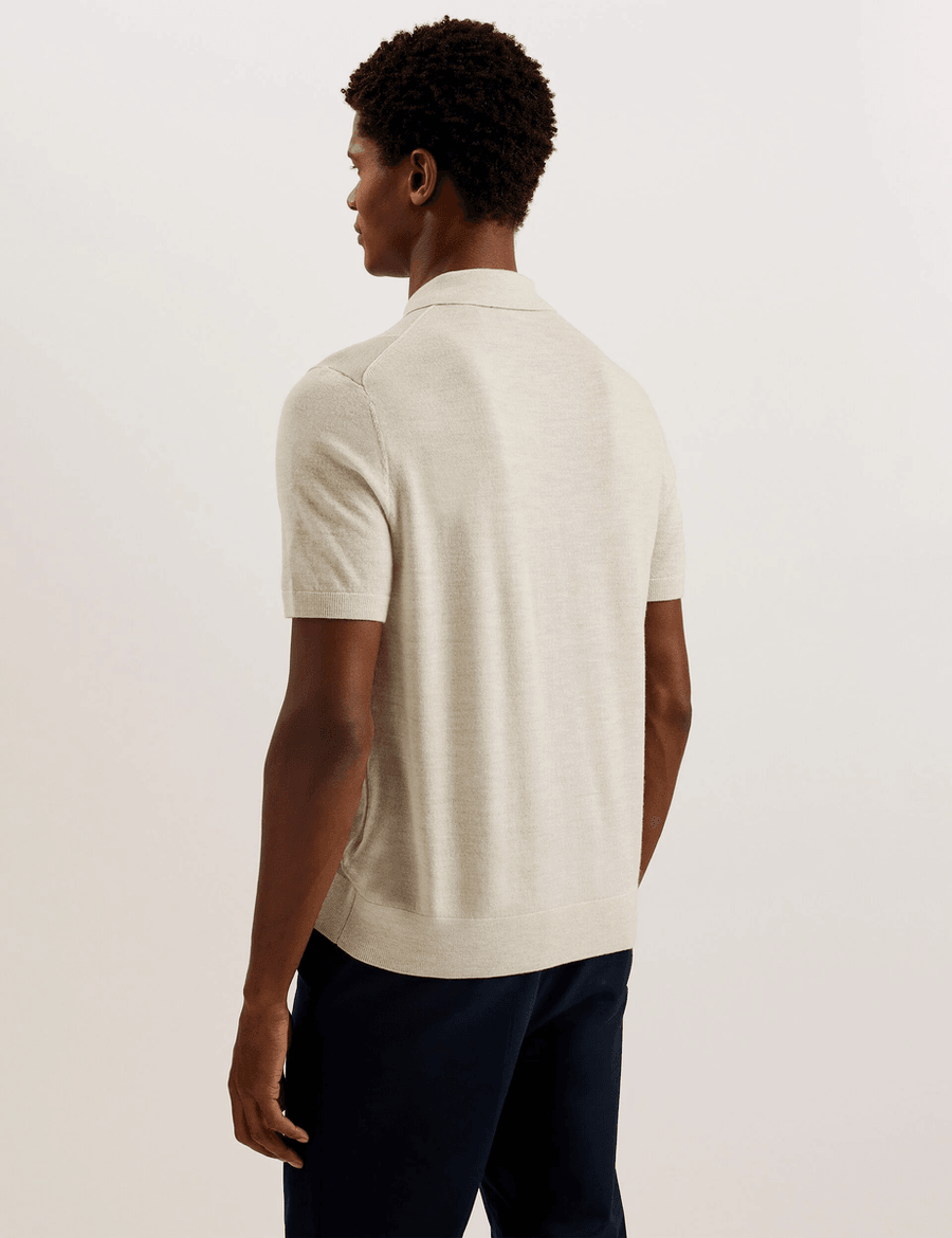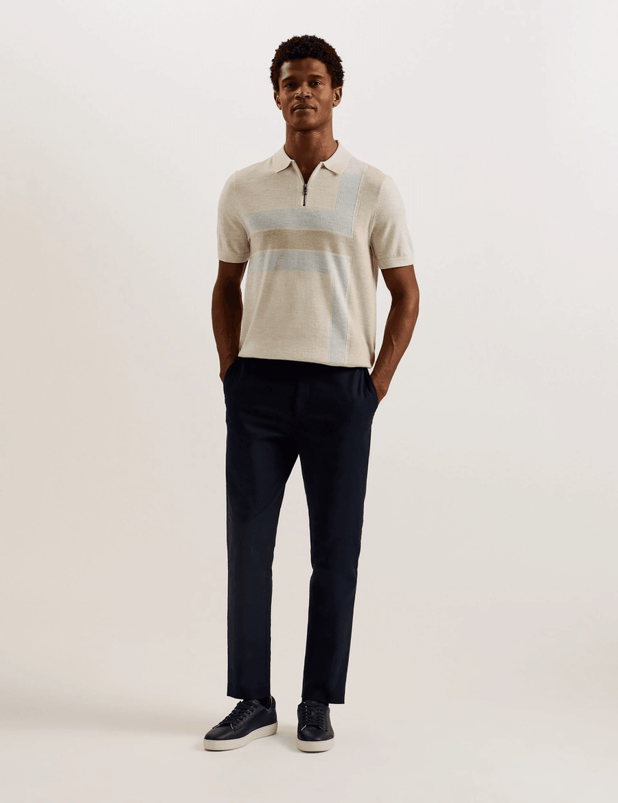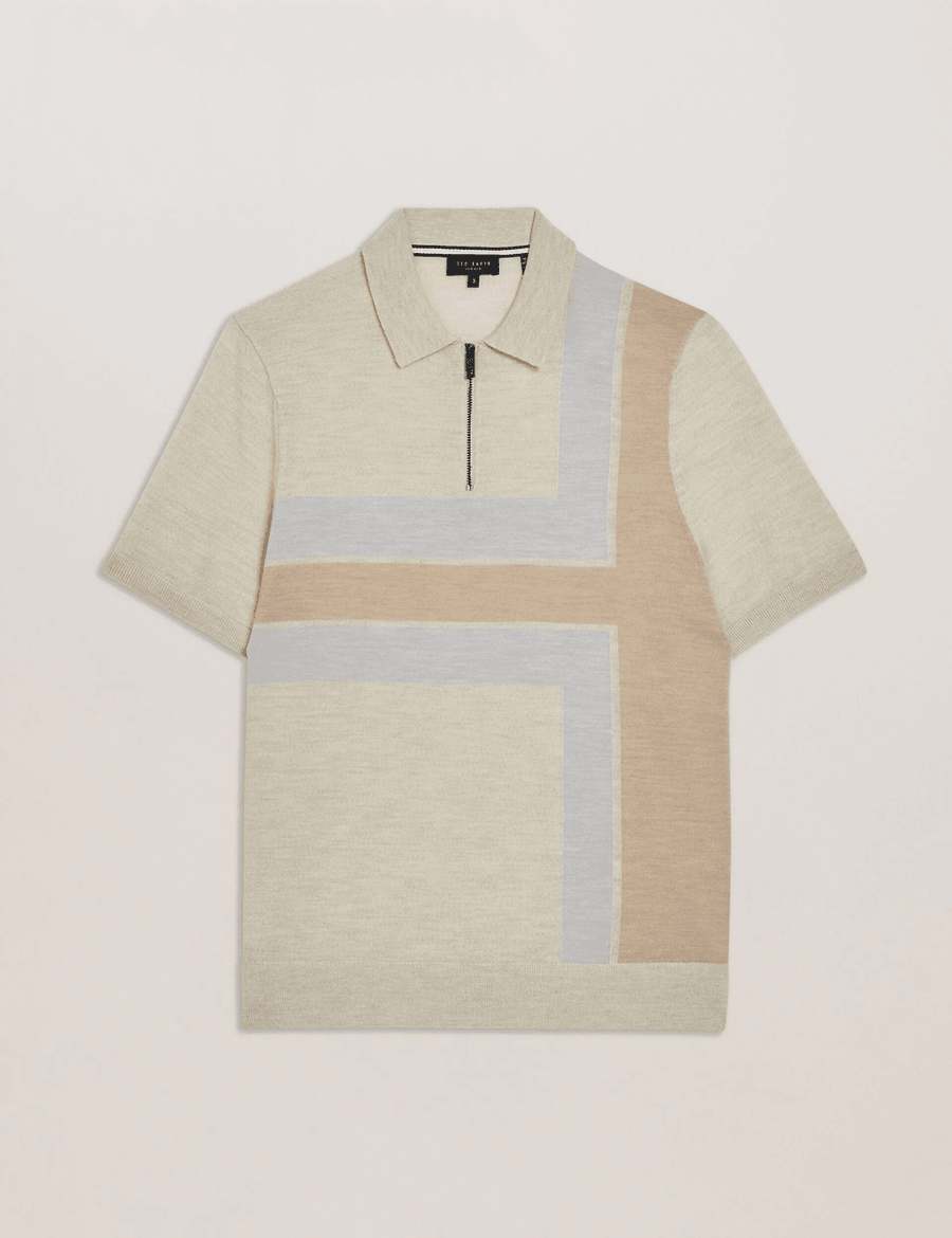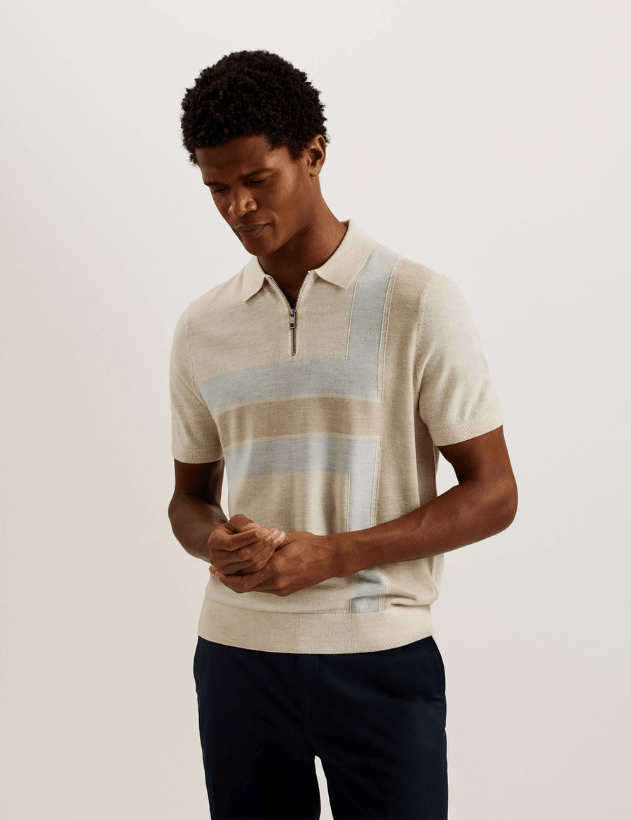Discover the Ted Baker AMBLER in Taupe, where classic meets contemporary. This pure wool polo shirt redefines sophistication with its unique colour block design and modern zip placket, making it a standout addition to your wardrobe.