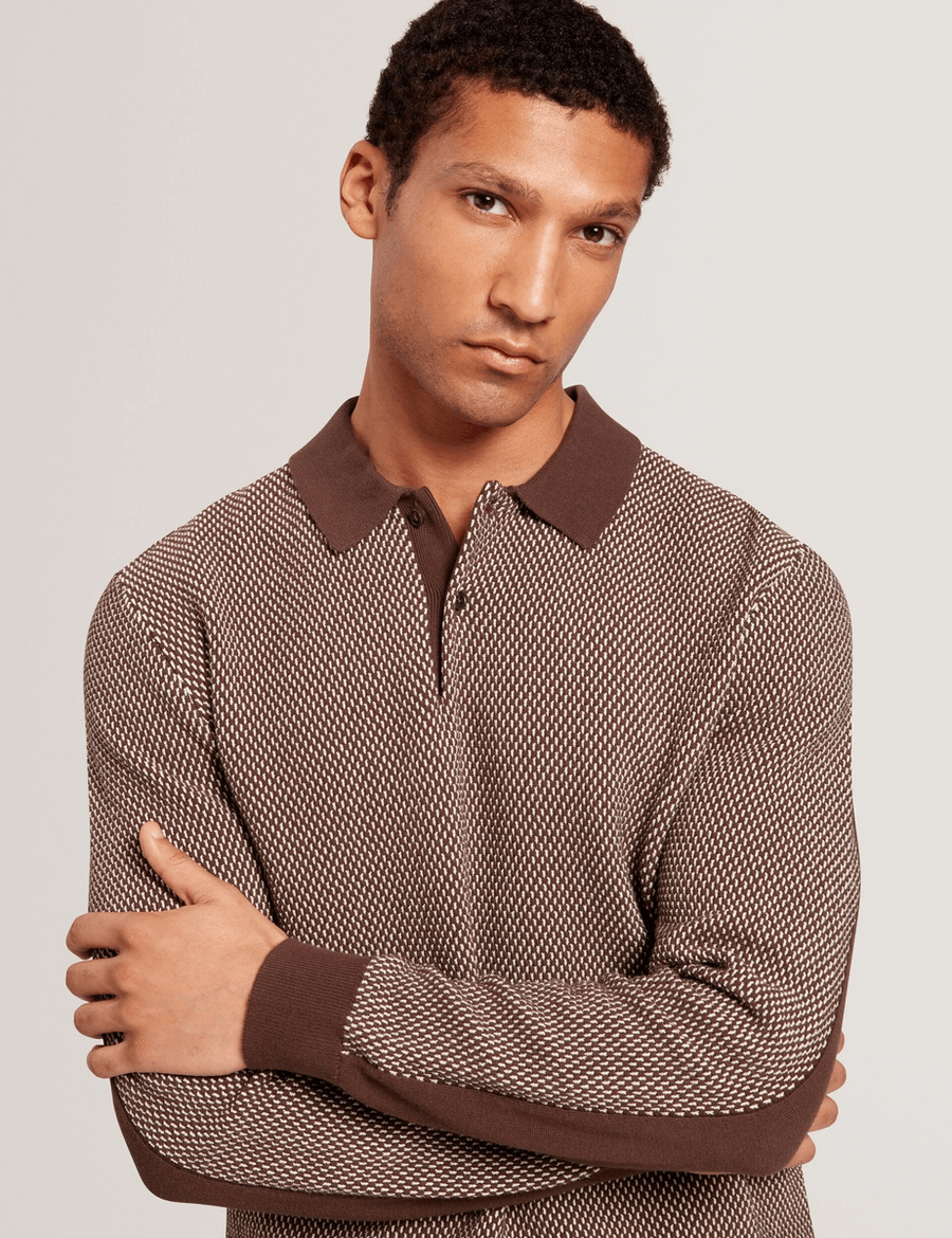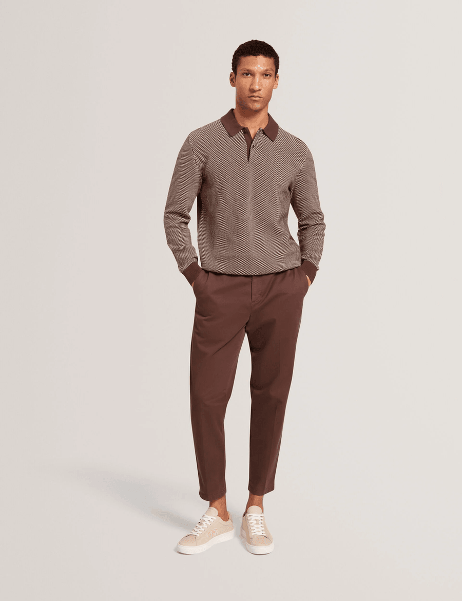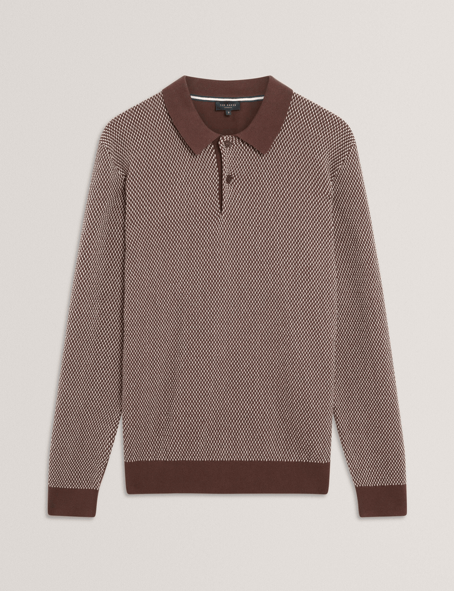 Discover the perfect blend of sophistication and comfort with the Ted Baker ARDO | DK-BROWN long sleeve polo shirt. Crafted from 100% premium cotton, this stylish piece features a unique textured front with contrast stitching and block color trims, making it an essential addition to your wardrobe.
