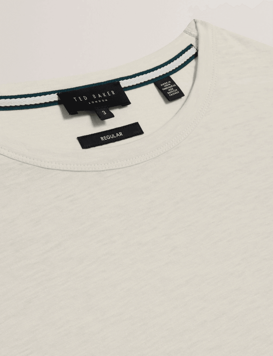 The Ted Baker BARTOL | NATURAL t-shirt features a timeless crew neck and short sleeves, making it a versatile addition to your collection. With a regular fit that flatters all body types, you can wear it confidently whether you're headed to the office or enjoying a casual weekend. Model Tobias, standing at 6'1" (1.86m), showcases the natural shade in a Ted size 3, demonstrating its perfect fit.