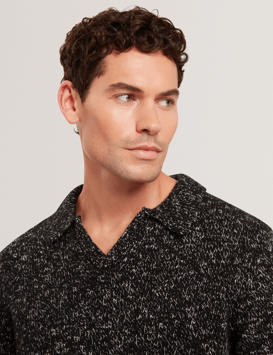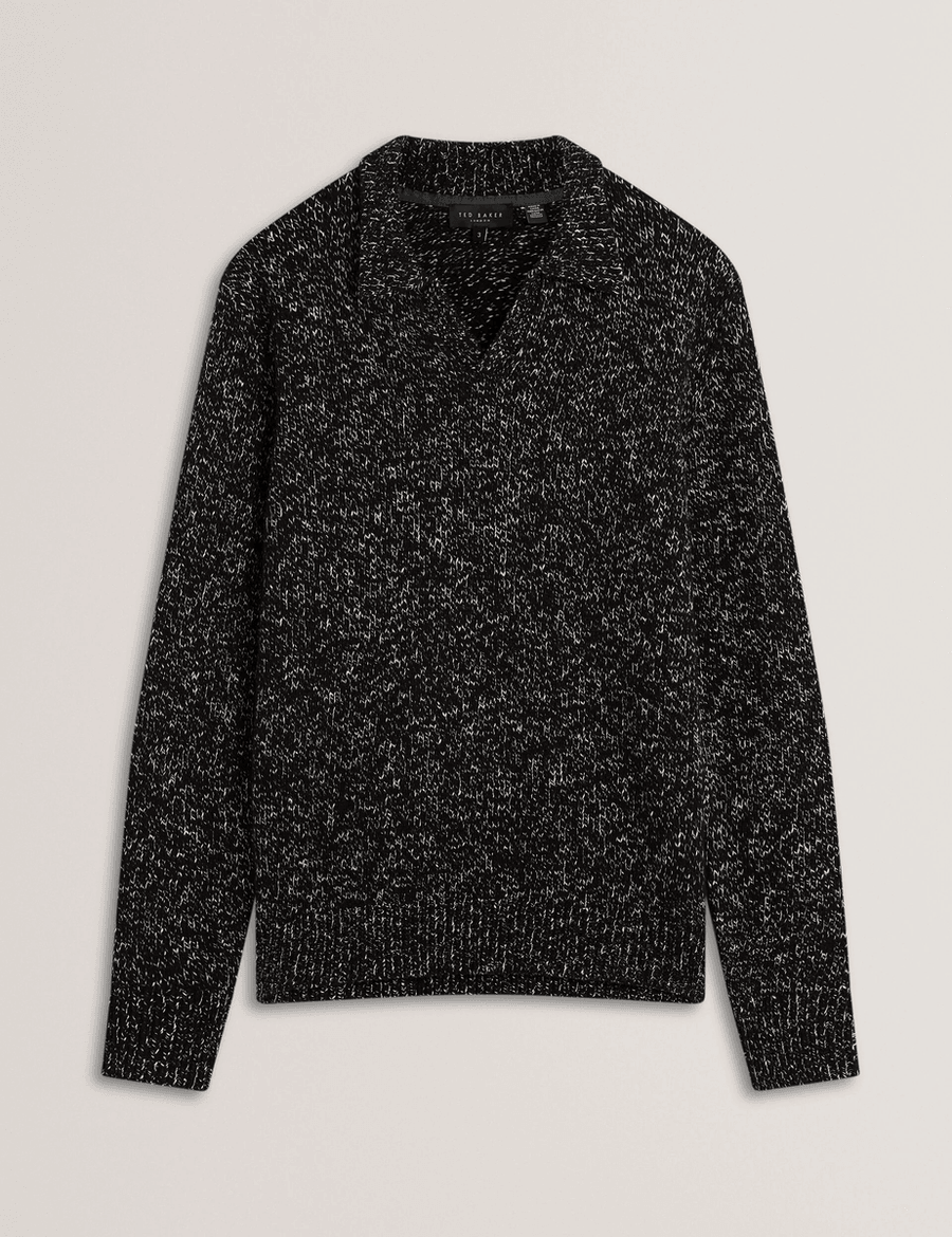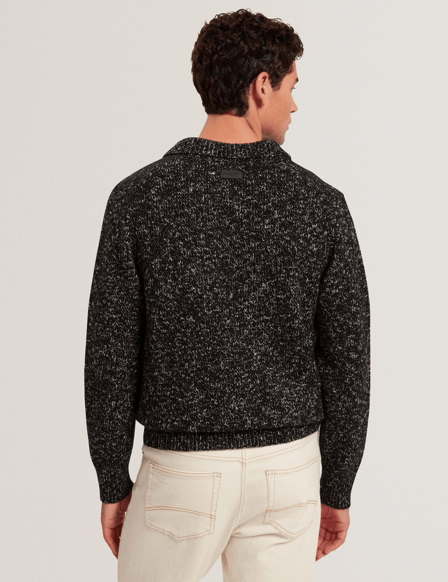Discover the perfect blend of comfort and sophistication with the Ted Baker BERRETO in black. This long sleeve polo shirt showcases a melange two-tone knit, making it an essential addition to your wardrobe for both casual and semi-formal occasions. Experience the luxurious feel of the cosy wool and cotton blend that ensures all-day wearability.