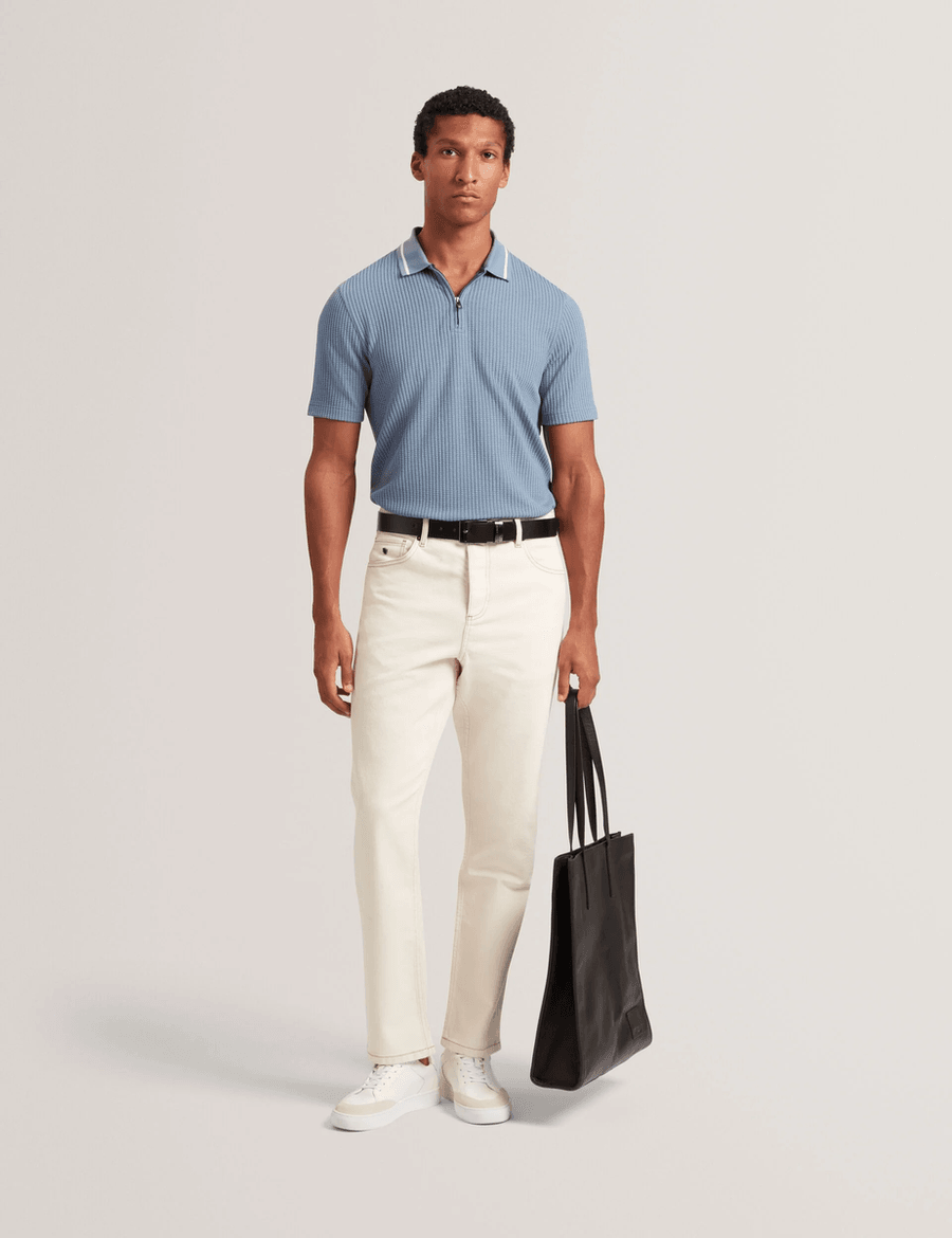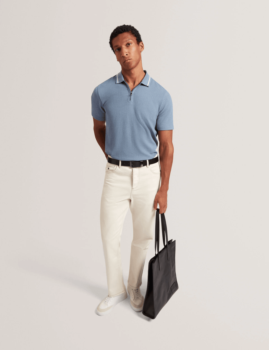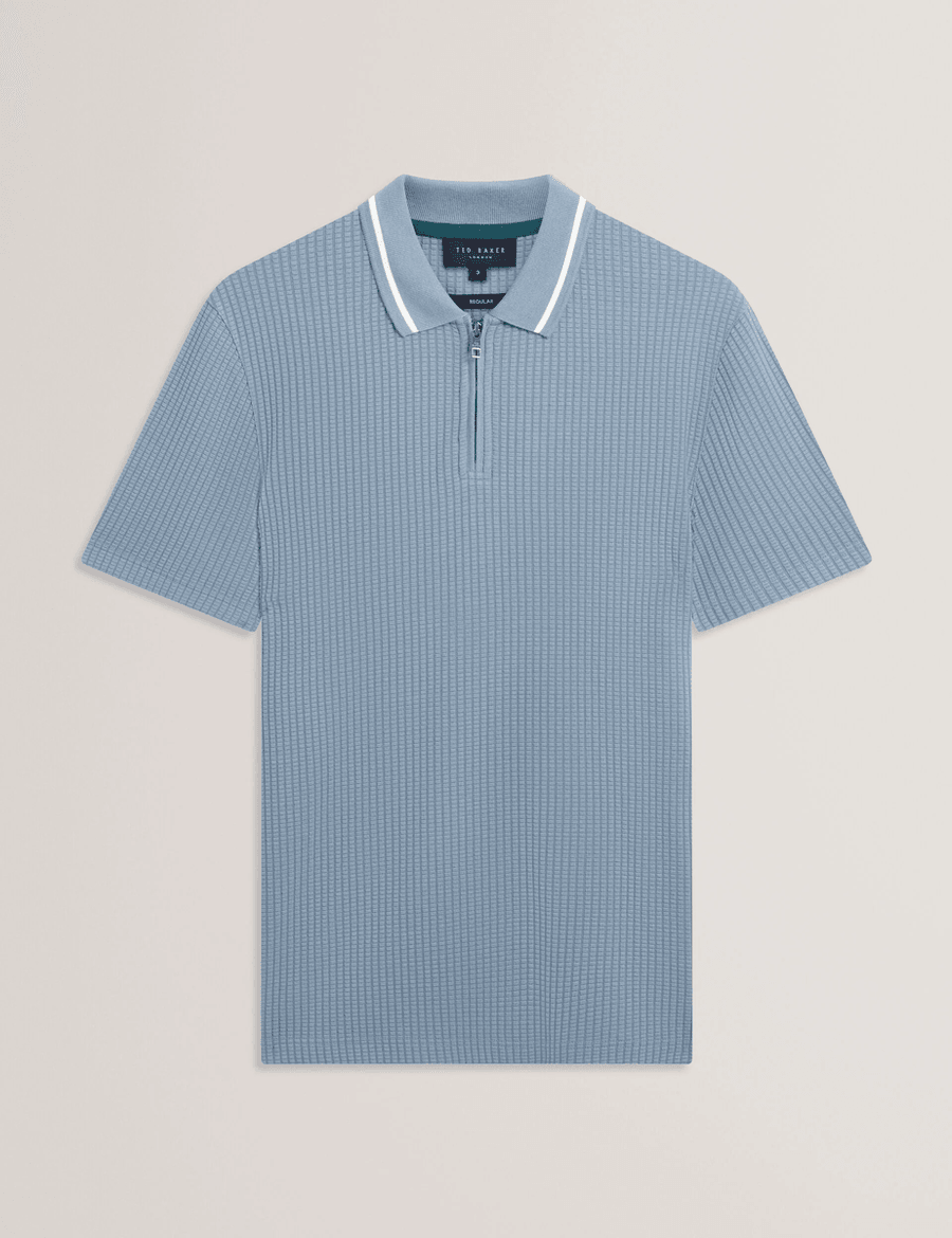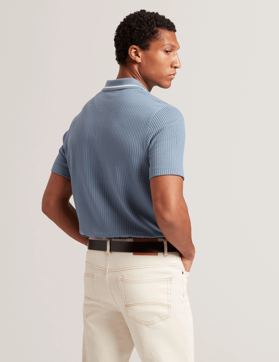Discover the perfect blend of comfort and sophistication with the Ted Baker BRONIZE | MID-BLUE polo shirt. Crafted from stretchy knitted fabric, this stylish piece features a ribbed grid texture that adds a modern twist to your wardrobe. Whether you’re dressing up for a casual outing or keeping it relaxed at home, this polo is your go-to choice.