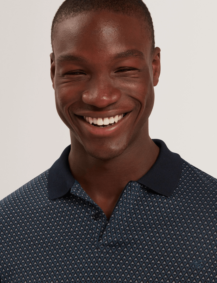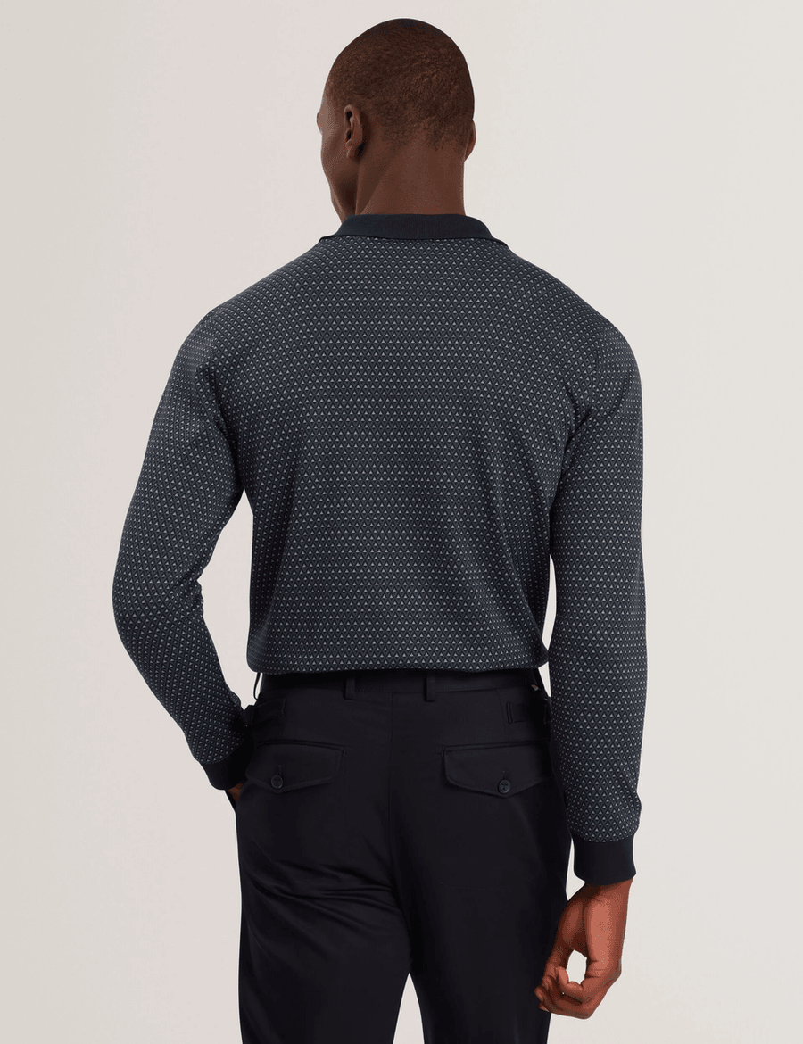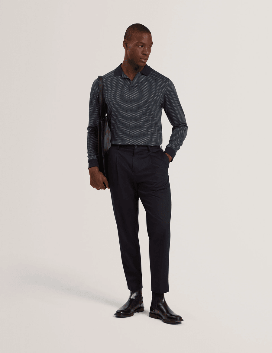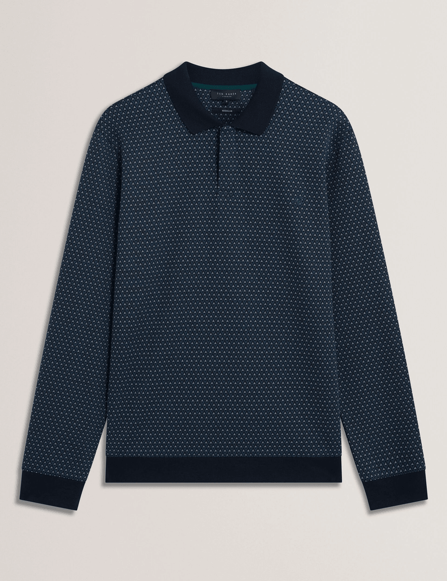 Introducing the Ted Baker DURAND | NAVY, a classic long sleeve polo that perfectly blends sophistication with comfort. This standout staple features a retro-inspired micro geometric pattern, making it an essential addition to your wardrobe.