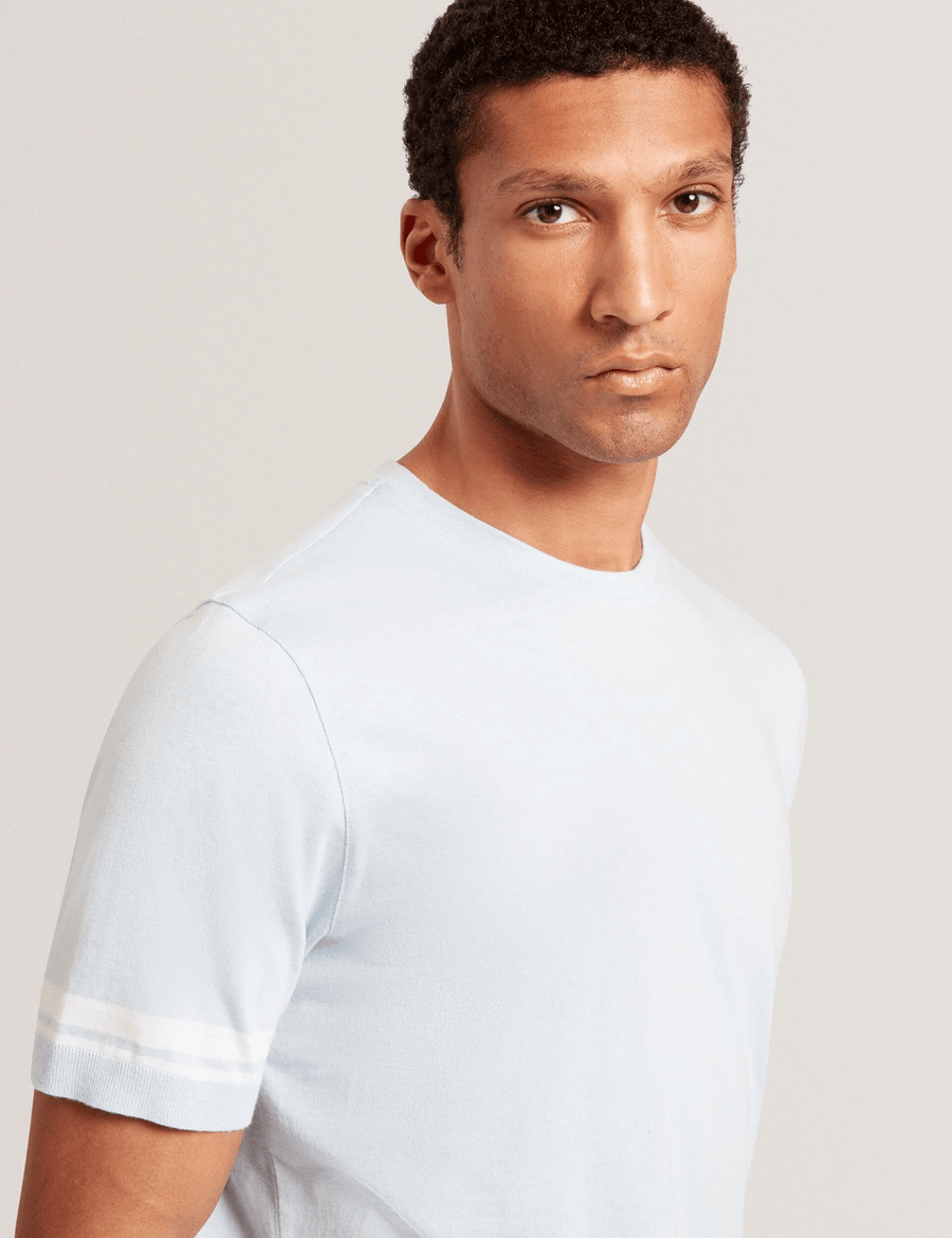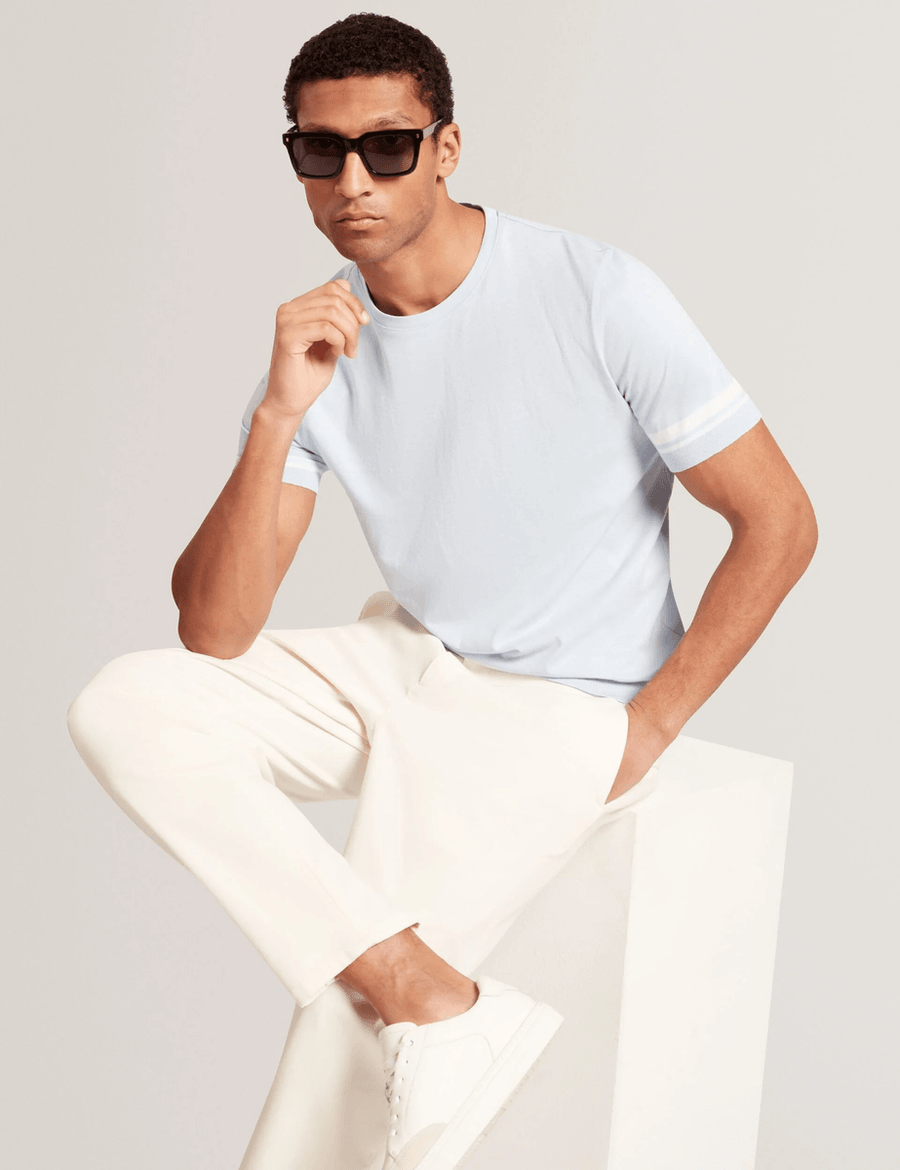 Whether you're dressing up for a casual outing or relaxing at home, this t-shirt provides unmatched comfort and style. Its double block stripe trims add a fashionable edge, ensuring you stand out effortlessly.