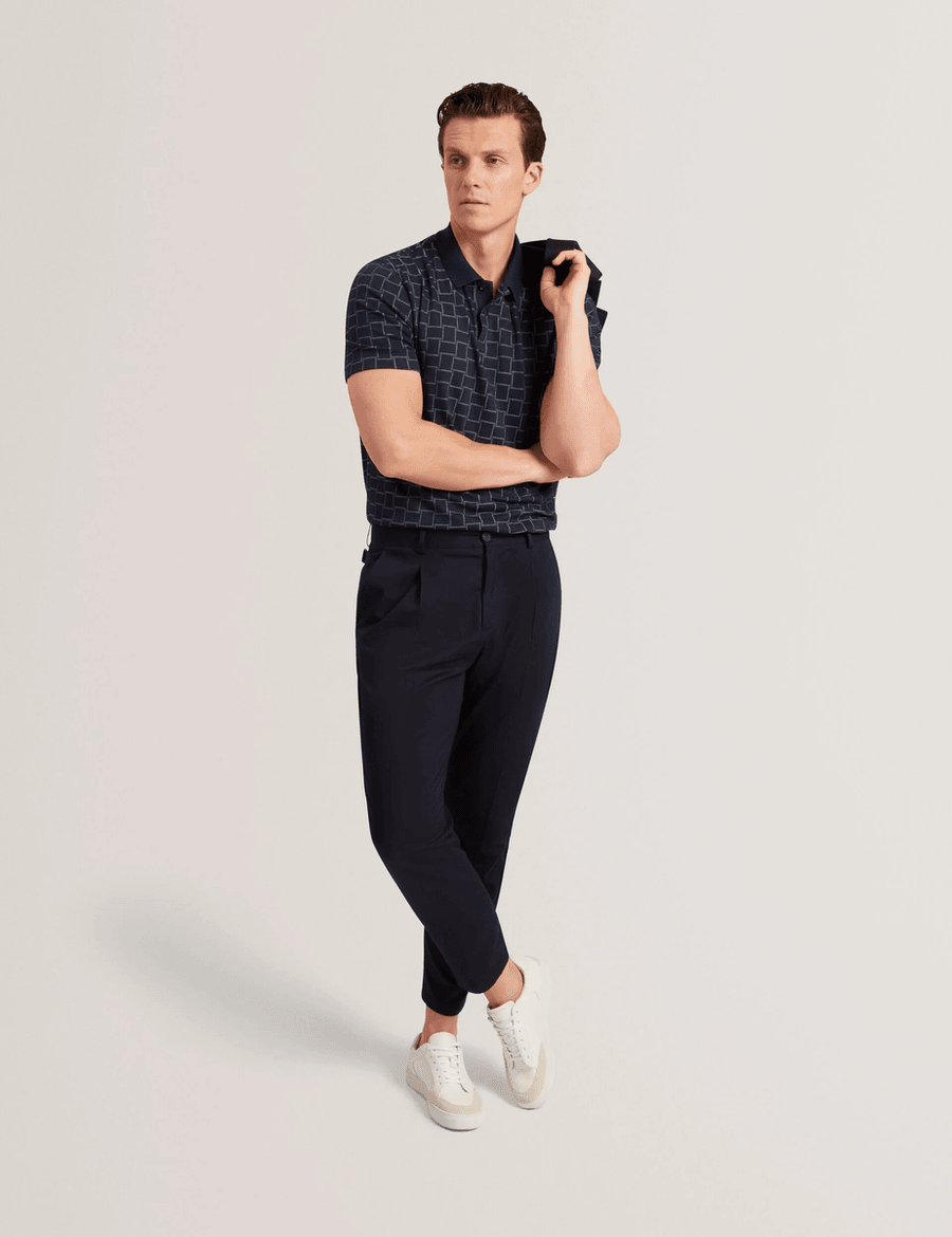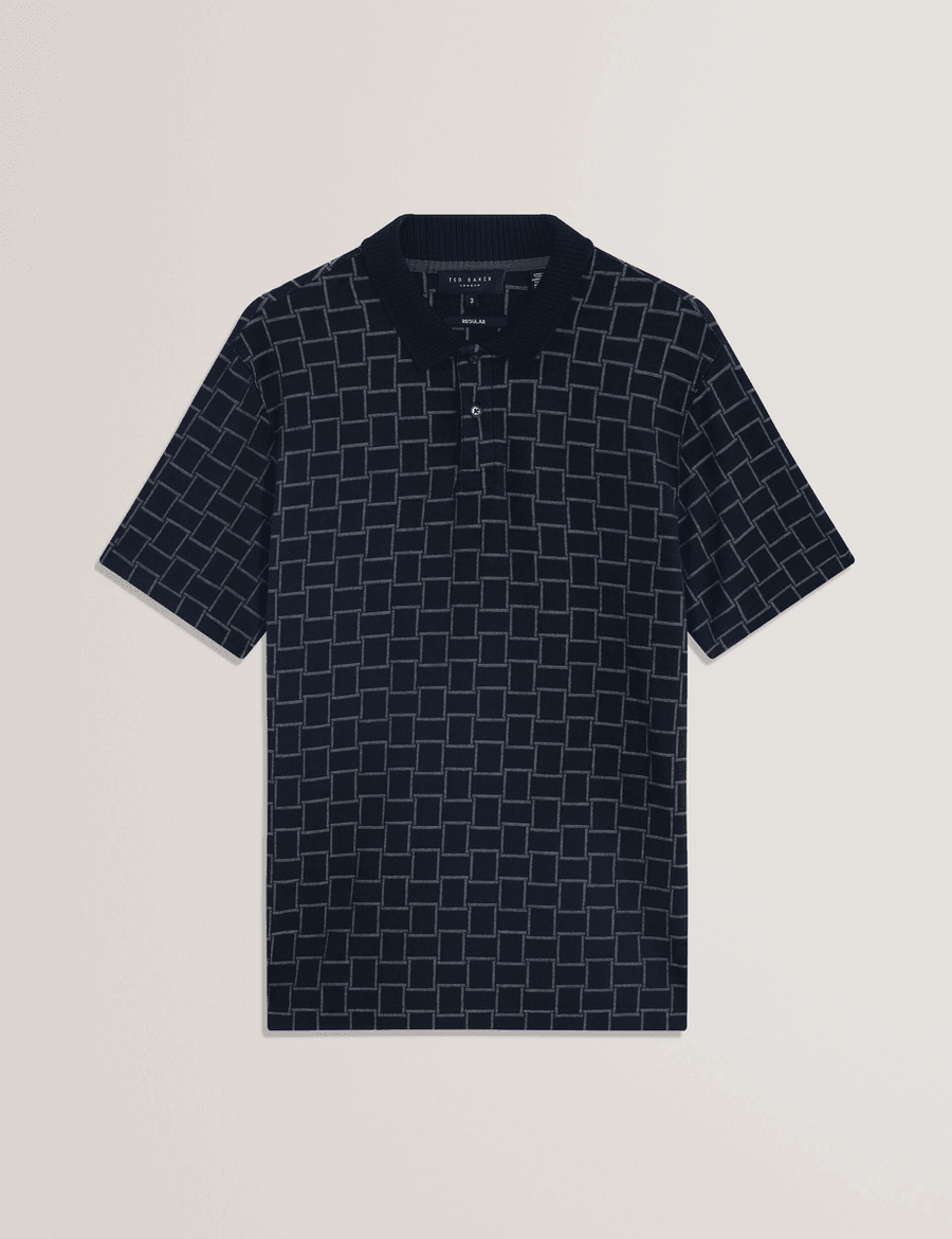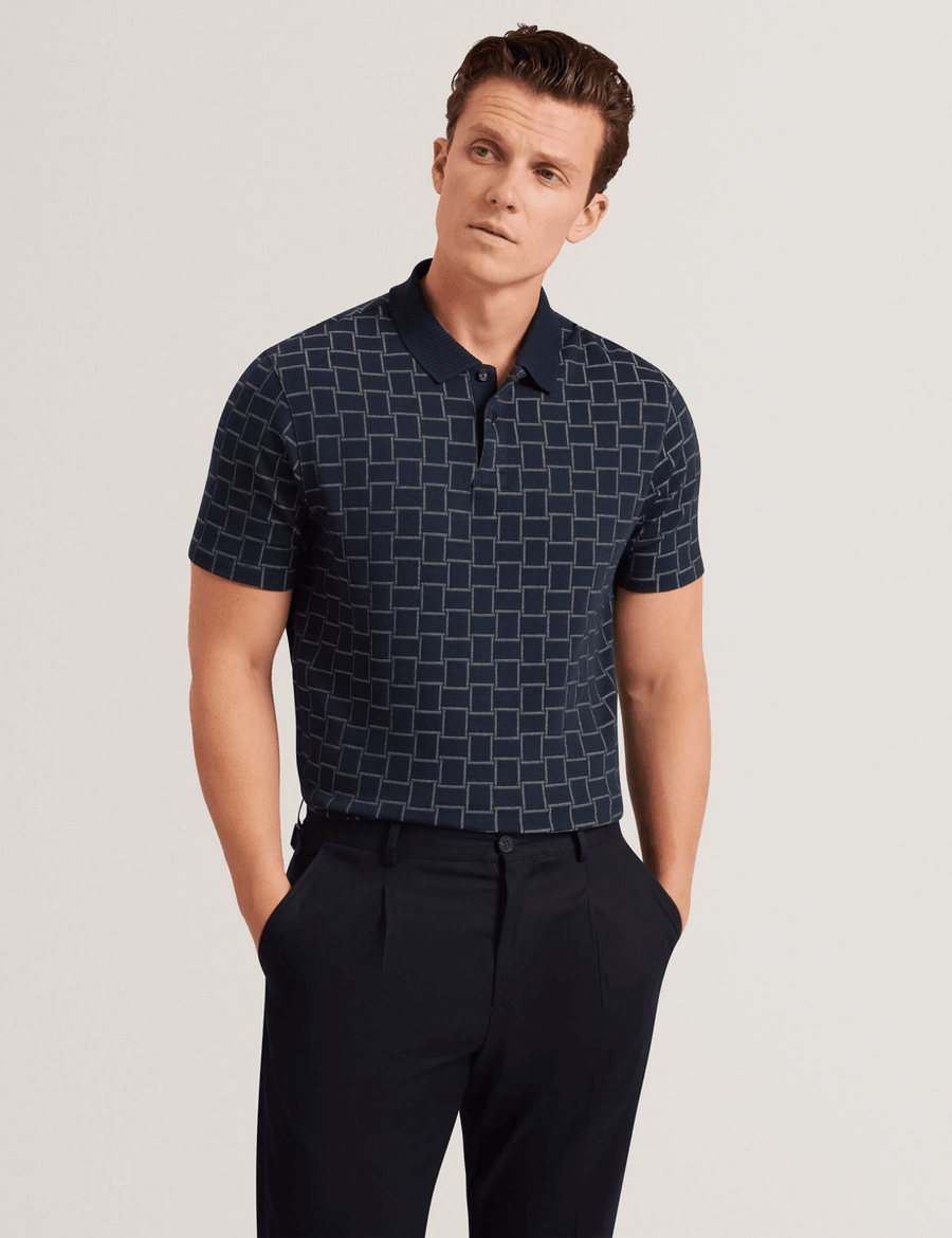 Discover the perfect blend of style and comfort with the Ted Baker EDUARD | Navy polo. Crafted from high-quality jacquard mixed square pattern stretch knit fabric, this short sleeve polo is designed for the modern man who values both fashion and function. Whether you're heading to the office or enjoying a weekend outing, this polo is your go-to choice.
