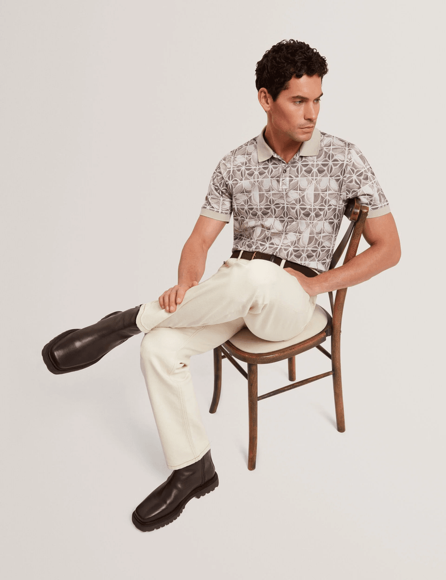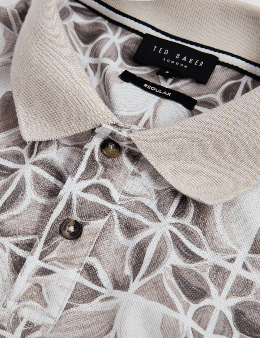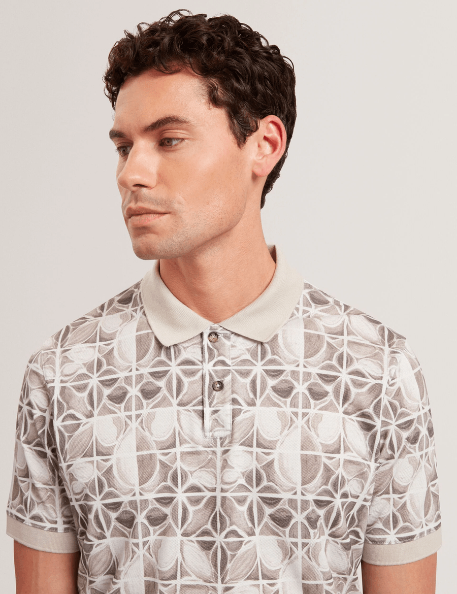 Elevate your style with the Ted Baker ERICKE | ECRU short sleeve polo shirt, featuring a stunning stained glass window print. Crafted from premium pique cotton, this shirt combines comfort with a unique aesthetic that stands out in any setting.