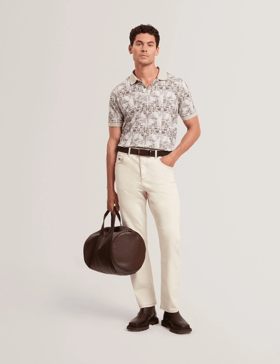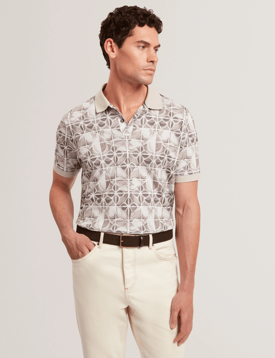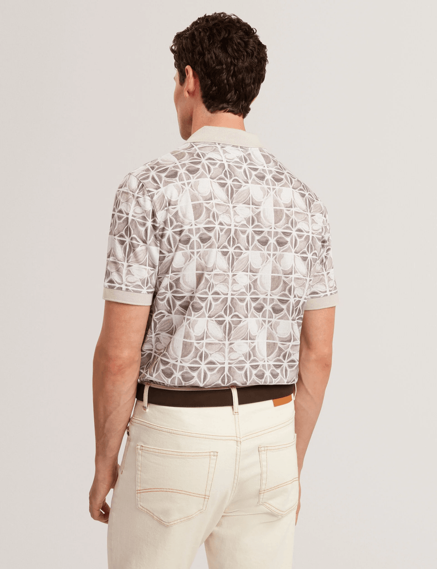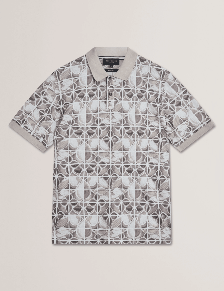 Elevate your style with the Ted Baker ERICKE | ECRU short sleeve polo shirt, featuring a stunning stained glass window print. Crafted from premium pique cotton, this shirt combines comfort with a unique aesthetic that stands out in any setting.