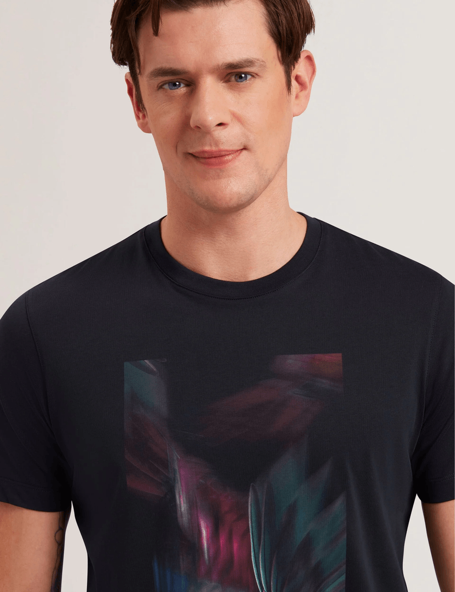 Discover the perfect blend of comfort and style with the Ted Baker FETHER | NAVY. This striking t-shirt features a feather graphic box print that makes a bold fashion statement, ideal for casual outings or relaxed weekends.