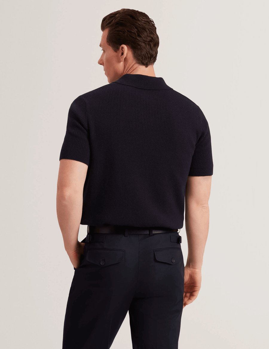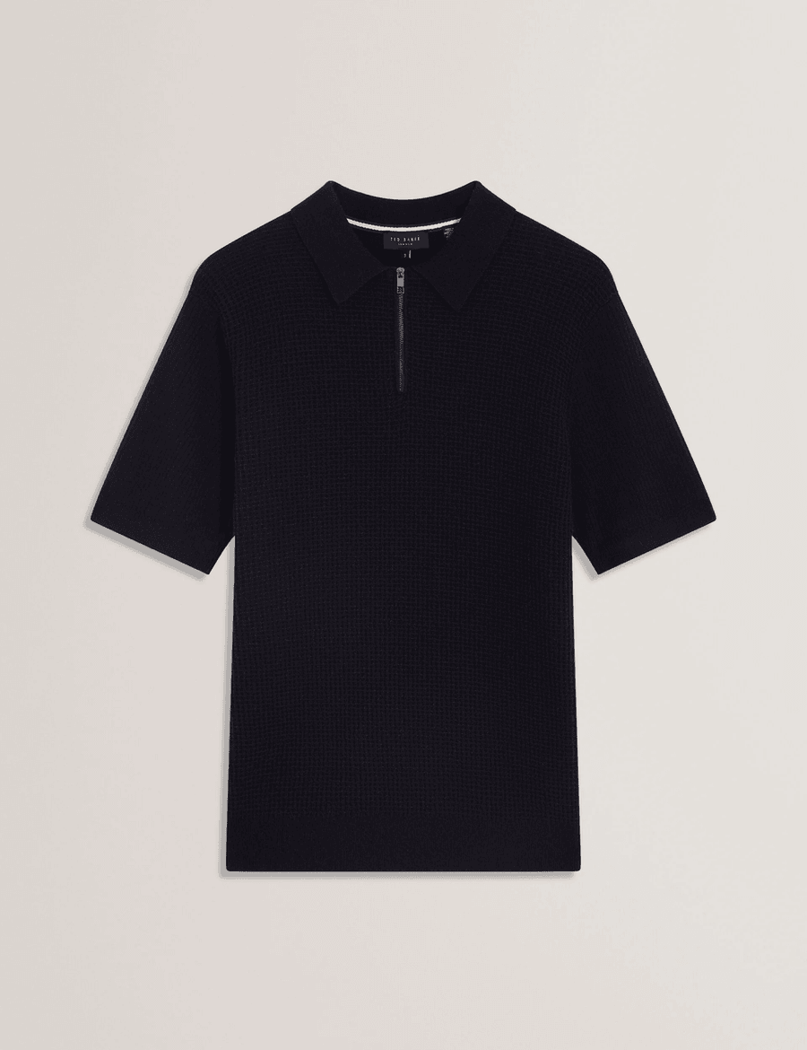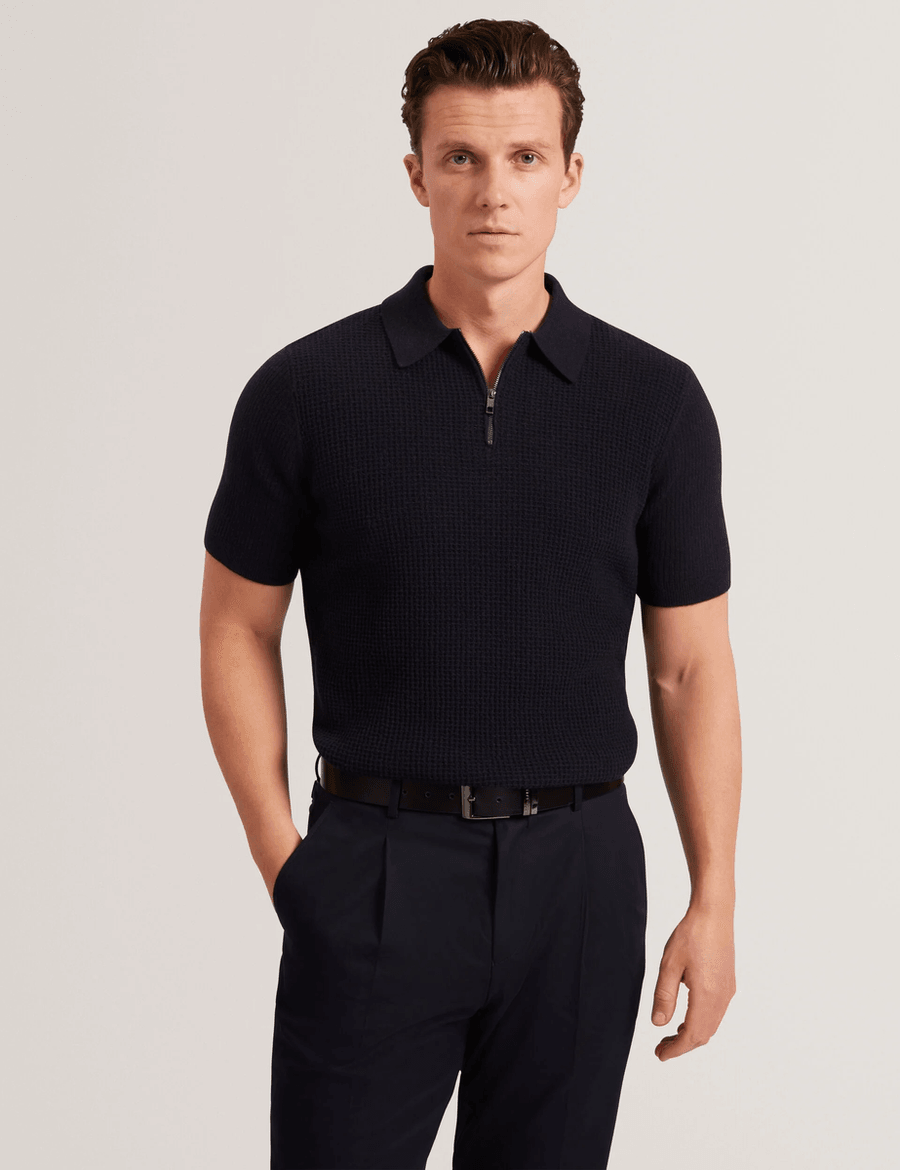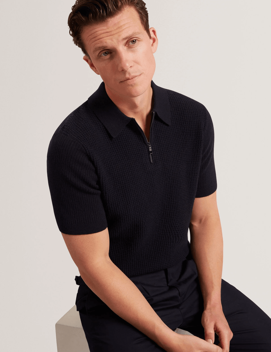 Discover the perfect blend of comfort and sophistication with the Ted Baker JAYLON | NAVY short sleeve polo shirt. This stylish piece features a unique waffle textured front panel that sets it apart, making it an essential addition to any modern wardrobe.