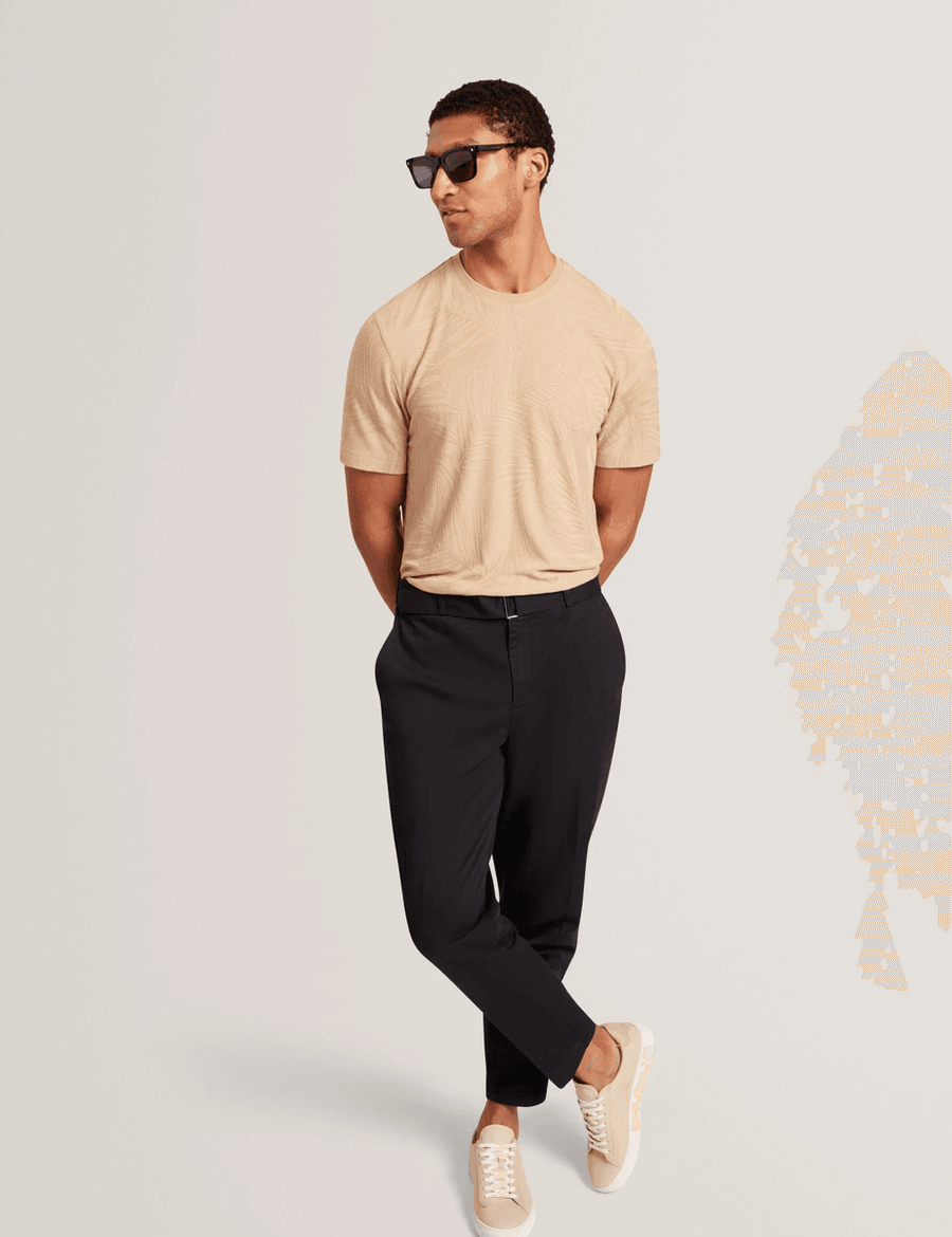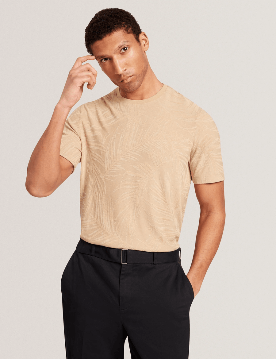 Discover the perfect blend of style and comfort with the Ted Baker JESSPER | BEIGE short sleeve t-shirt. Crafted with a jacquard tonal leaf print, this t-shirt adds a touch of sophistication to your everyday look. Made from breathable knitted fabric, it ensures you stay cool and comfortable all day long.