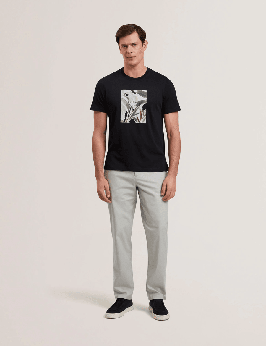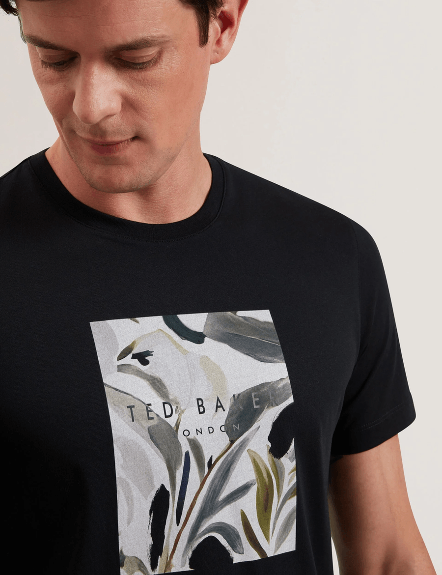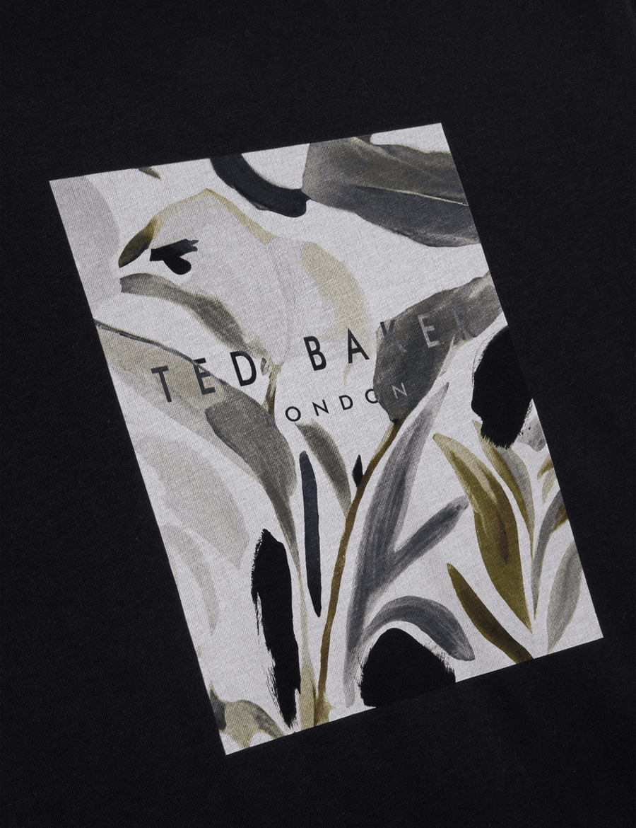 Discover the perfect blend of comfort and style with the Ted Baker JUSTINO | BLACK crew neck short sleeve t-shirt. Featuring a striking painted floral box graphic and a printed logo at the center, this t-shirt is designed to make a statement while keeping you effortlessly chic.